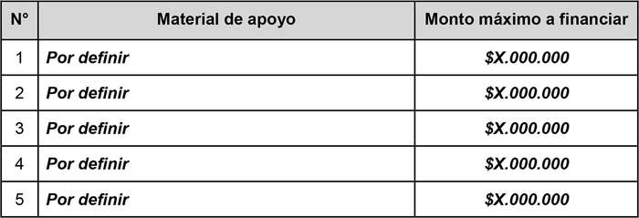 Cada estudiante podrá solicitar, por una única vez, un máximo de materiales de apoyo por determinar, hasta el monto total máximo que sea indicado en el Anexo Nº1 del año correspondiente. En caso de que el costo de los materiales de apoyo exceda el máximo disponible, dicho valor deberá ser cubierto por el o la estudiante.