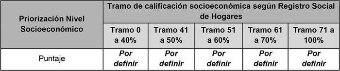 a. Priorización por situación socioeconómica de acuerdo al Registro Social de Hogares: Los/as postulantes obtendrán un puntaje conforme a su nivel socioeconómico. Esta información será recabada del formulario de postulación de los/as estudiantes y puede ser corroborada por el/la evaluador/a, a través del sistema provisto por el Ministerio de Desarrollo Social y Familia.