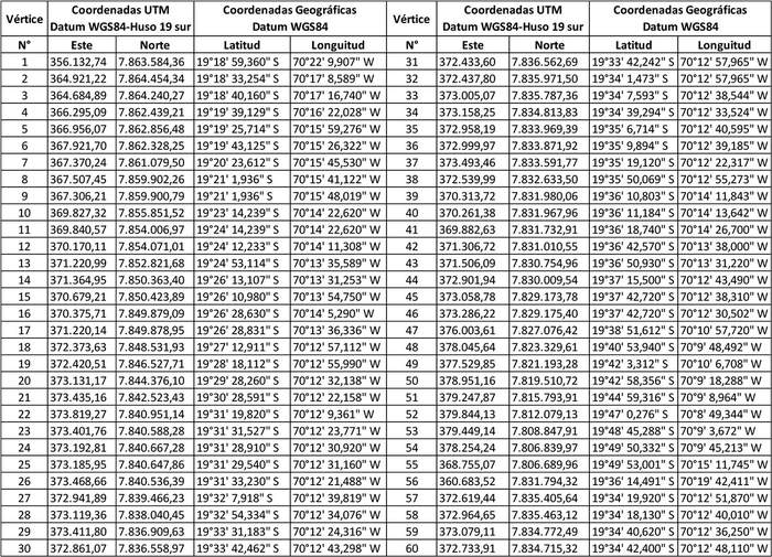 Artículo 2. Límites y coordenadas. Los límites del área marina costera protegida de múltiples usos, representados en el mapa adjunto, se detallan en coordenadas geográficas, Datum WGS84 y coordenadas proyectadas UTM Datum WGS84 Huso 19 sur, y son las siguientes: