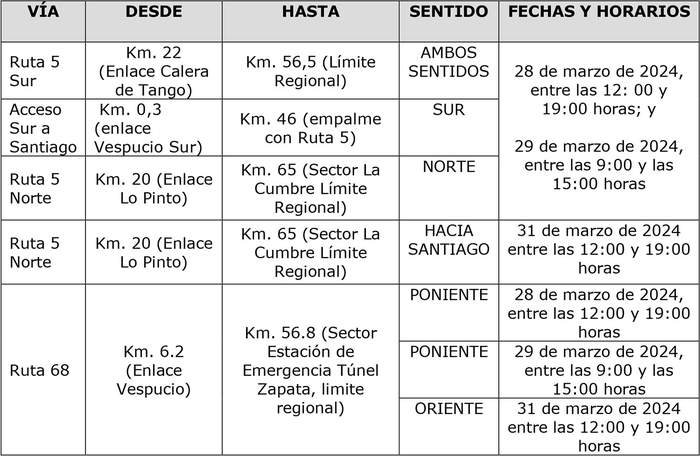 1.- Prohíbase la circulación de vehículos de carga de dos y más ejes, en Ruta Acceso Sur a Santiago, Ruta 5 Sur (tramo Santiago - Talca), Ruta 68 (Interconexión Vial Santiago - Valparaíso - Viña del Mar) y, Ruta 5 Norte (tramo Santiago - Los Vilos), los días 28, 29 y 31 de marzo de 2024, en los tramos, sentidos de tránsito, fechas y horarios que se indican en el siguiente cuadro: