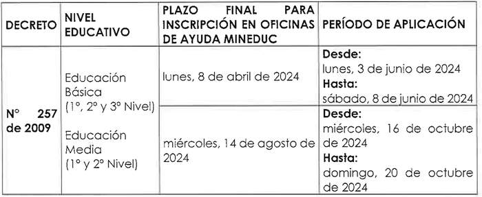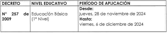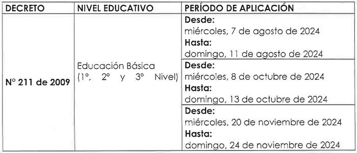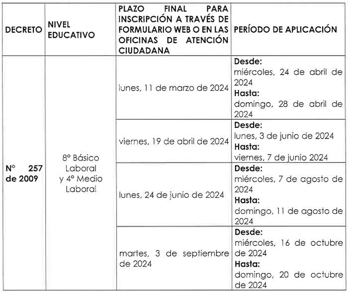 Artículo único: Fíjase para el año 2024 el Calendario Nacional de Examinación para las personas inscritas en los Programas de la Modalidad Flexible de Nivelación de Estudios, Validación de Estudios, Examinación de Estudios realizados en Programas de Alfabetización y Examen de Equivalencia para Fines Laborales, en los niveles de Educación Básica y Media, considerando la simultaneidad en su aplicación a nivel nacional, de acuerdo con el siguiente cuadro: