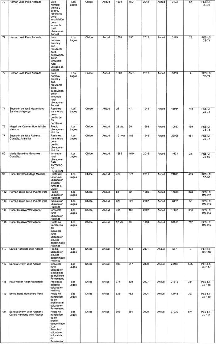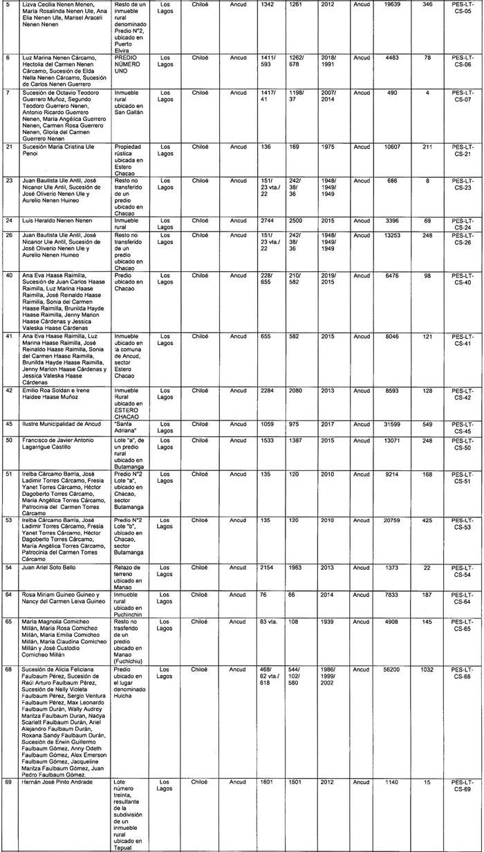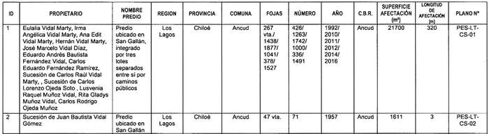 Artículo 7º.- Constitúyase, de acuerdo con lo que sobre el particular establece la Ley General de Servicios Eléctricos, las servidumbres para el establecimiento del "Tramo 1.1" del proyecto "Línea Nueva Puerto Montt-Nueva Ancud 2x500 kV, 2x1500 MVA, Sector Sur", en los inmuebles que se indican a continuación: