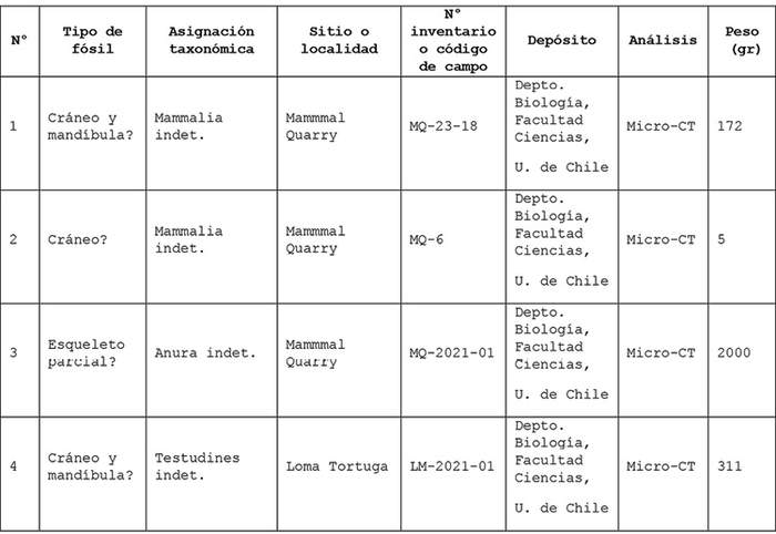 Artículo 1°: Autorízase la extracción desde el territorio nacional, a contar de la fecha de publicación del presente decreto, de 4 muestras de material paleontológico proveniente de la Formación Dorotea (Región de Magallanes), localidades denominadas "Mammal Quarry" y "Loma Tortuga", en el marco del proyecto "Evolutionary and Biogeographical History of Late Cretaceous Tetrapods from Magallanes, Subantarctic Chile" (Fondecyt Regular 1230713). La salida de las muestras fue solicitada por Alexander Vargas M. y a continuación se individualizan:
