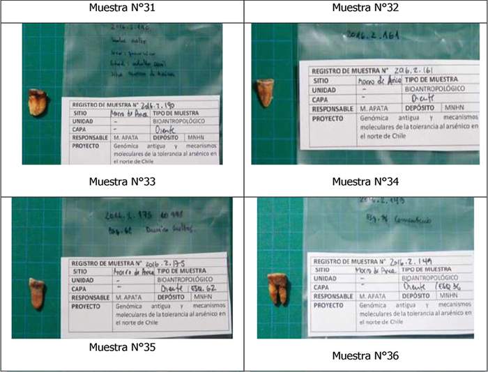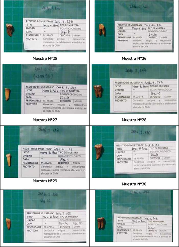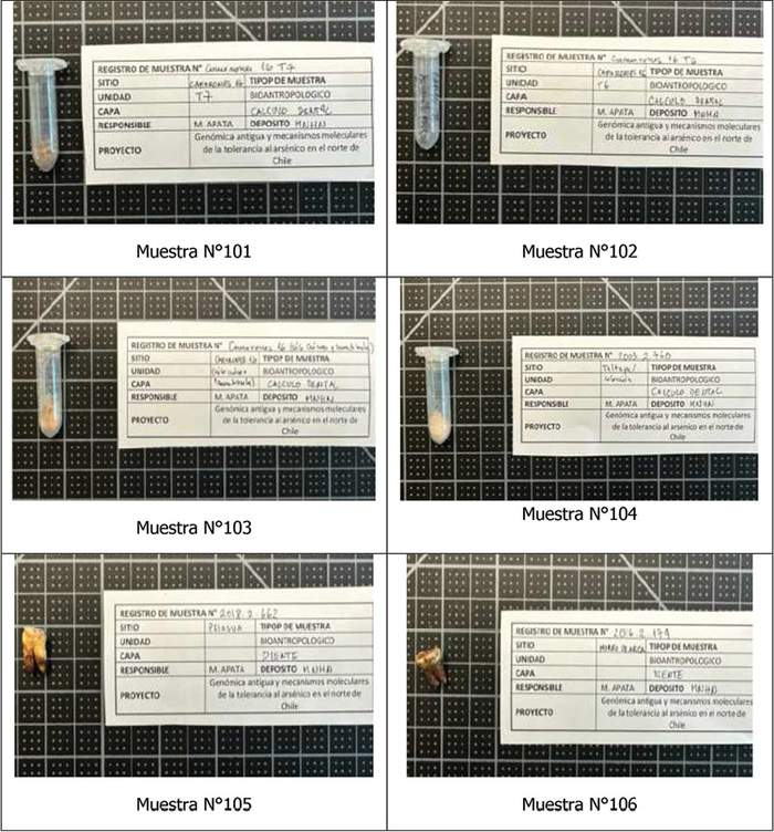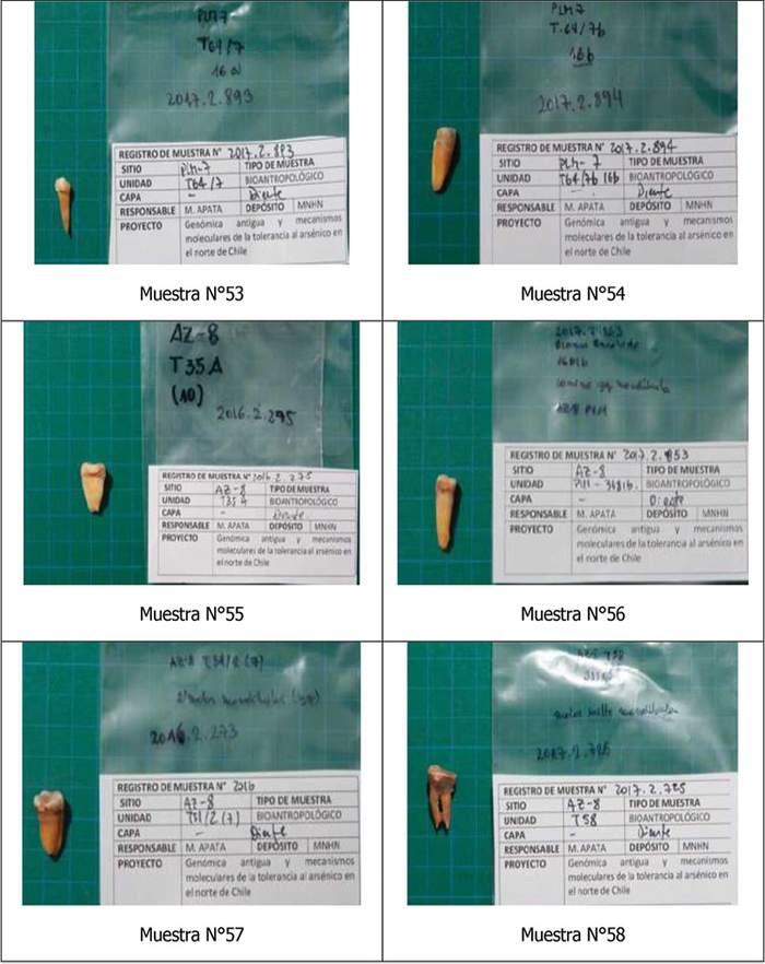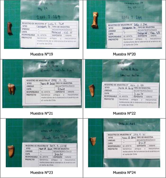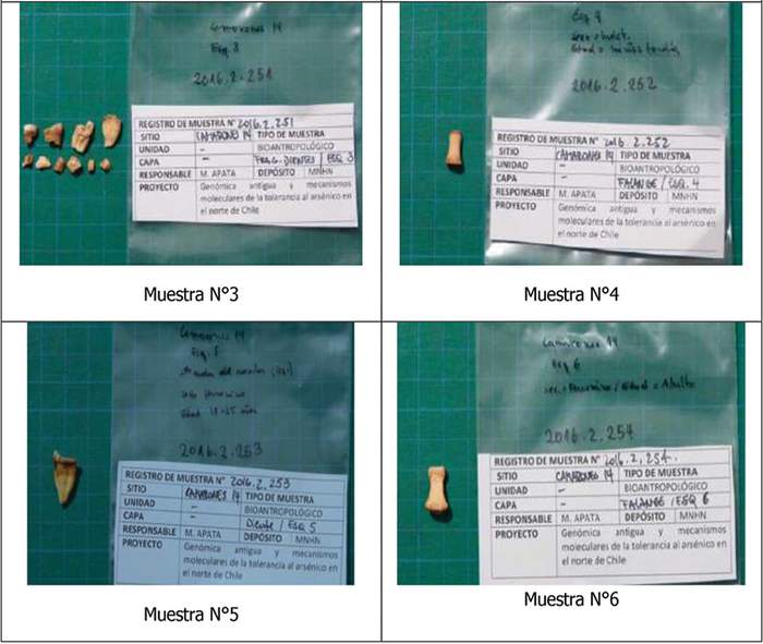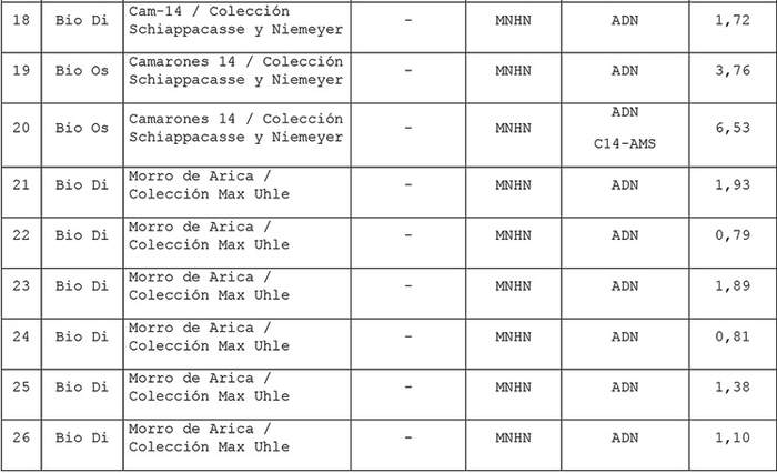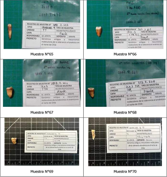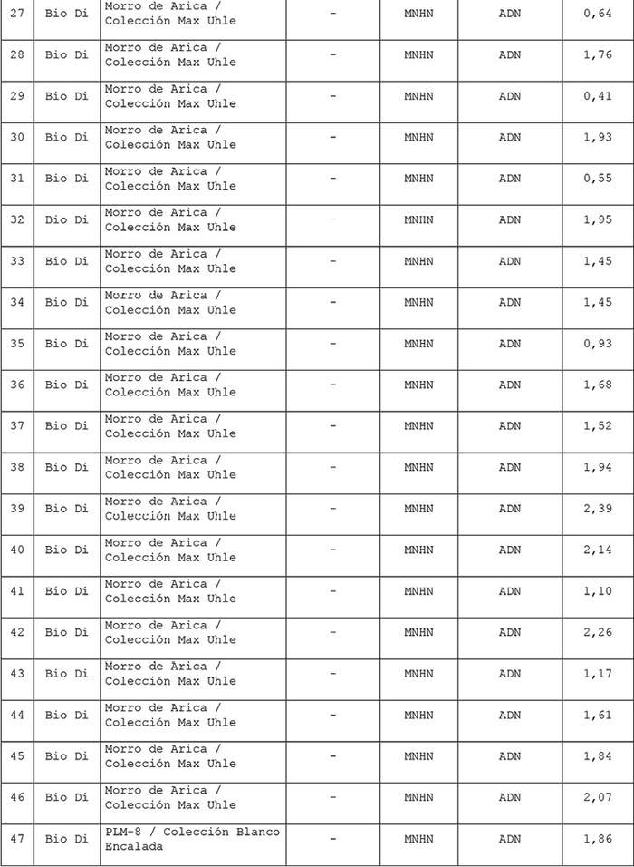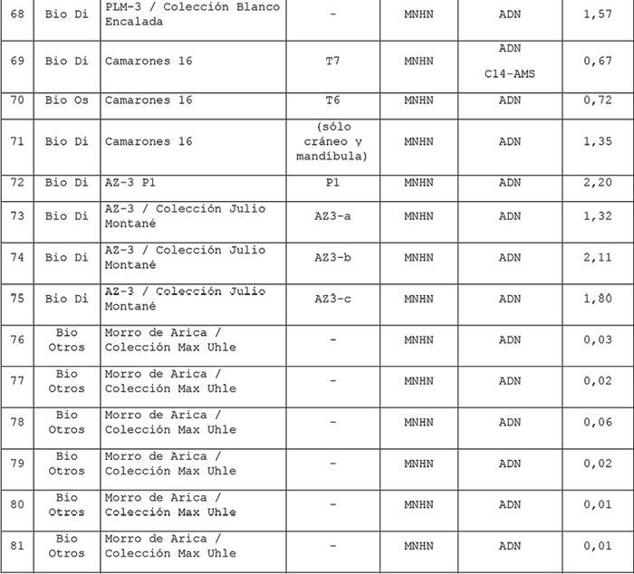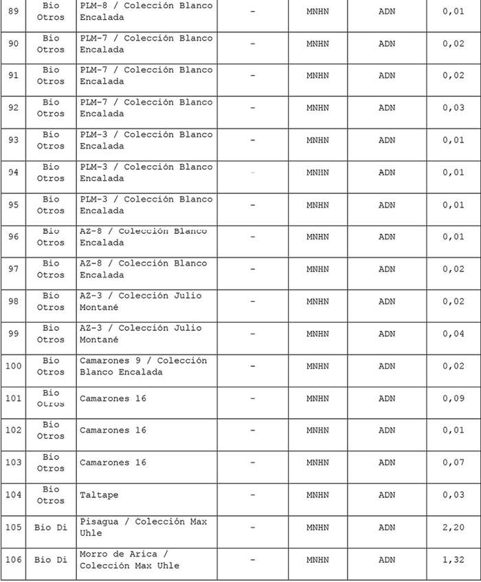 Artículo 4°: Autorízase la extracción desde el territorio nacional, a contar de la fecha de publicación del presente decreto, de 106 muestras arqueológicas al extranjero, con destino a la Universidad Estatal de Arizona, Estados Unidos, en el marco de investigación por genómica antigua y mecanismos moleculares de la tolerancia al arsénico en el norte de Chile. La salida de las muestras fue solicitada por Mario Andrés Apata Mamani y que a continuación se individualizan: