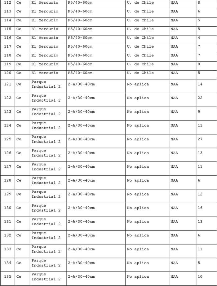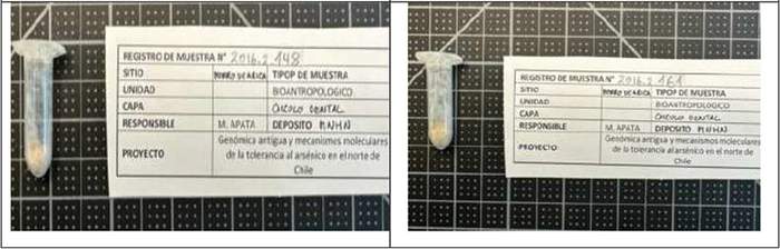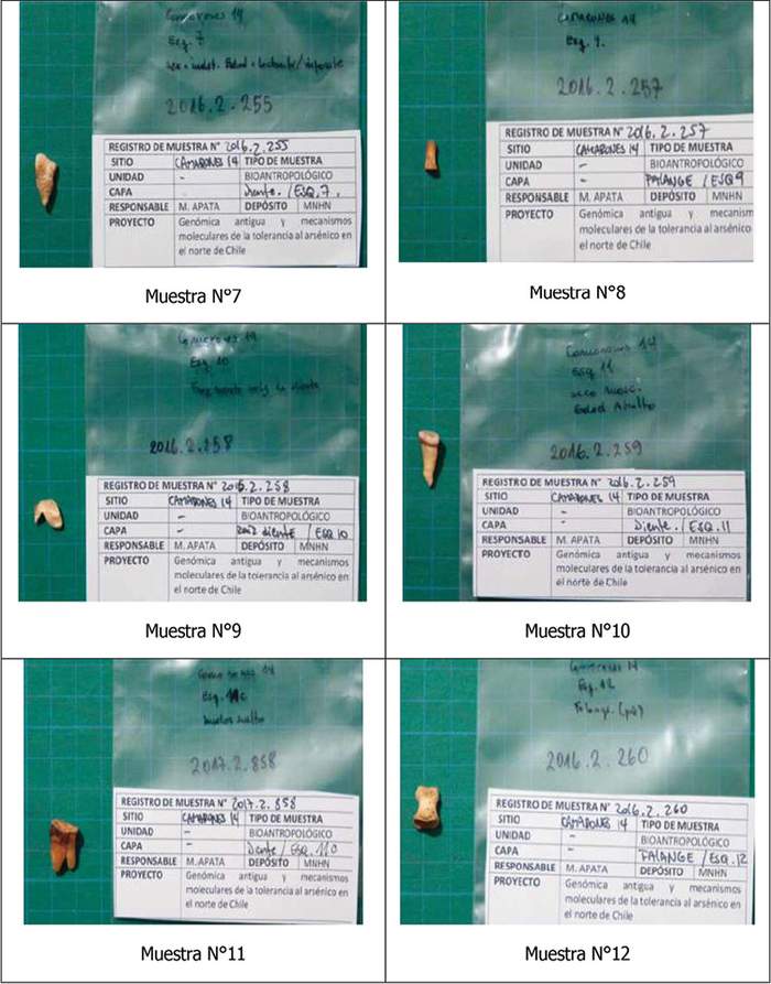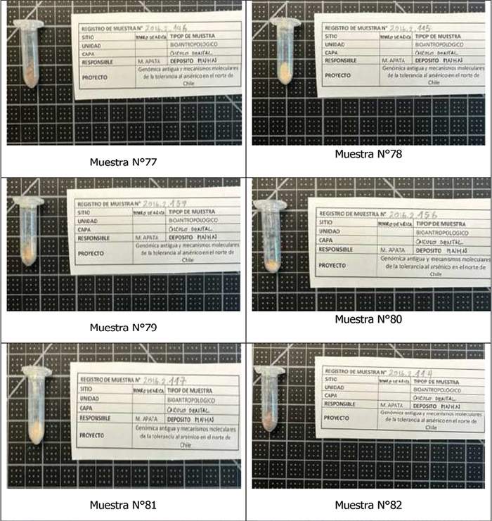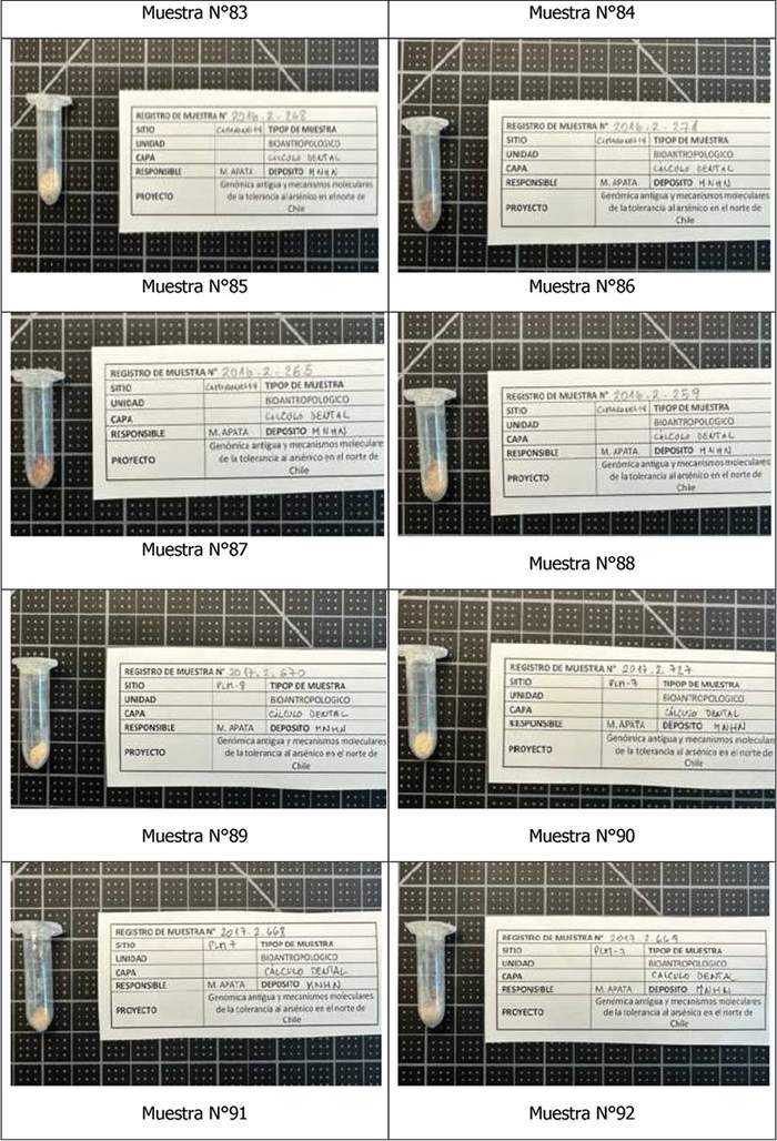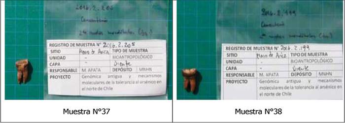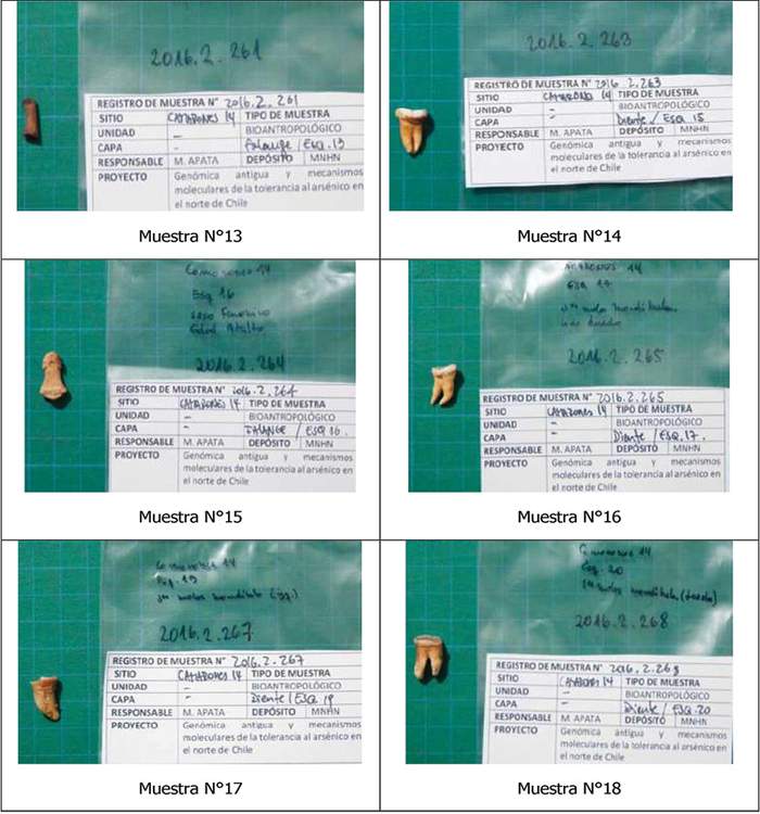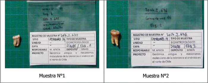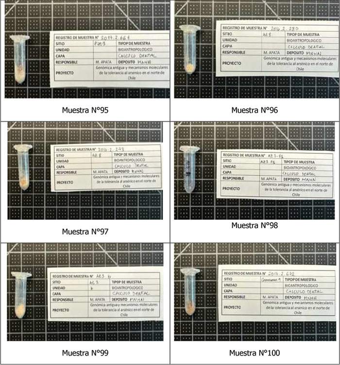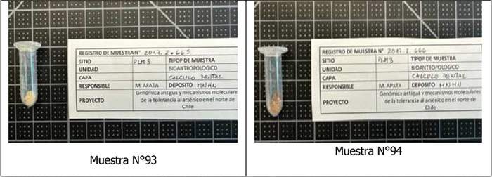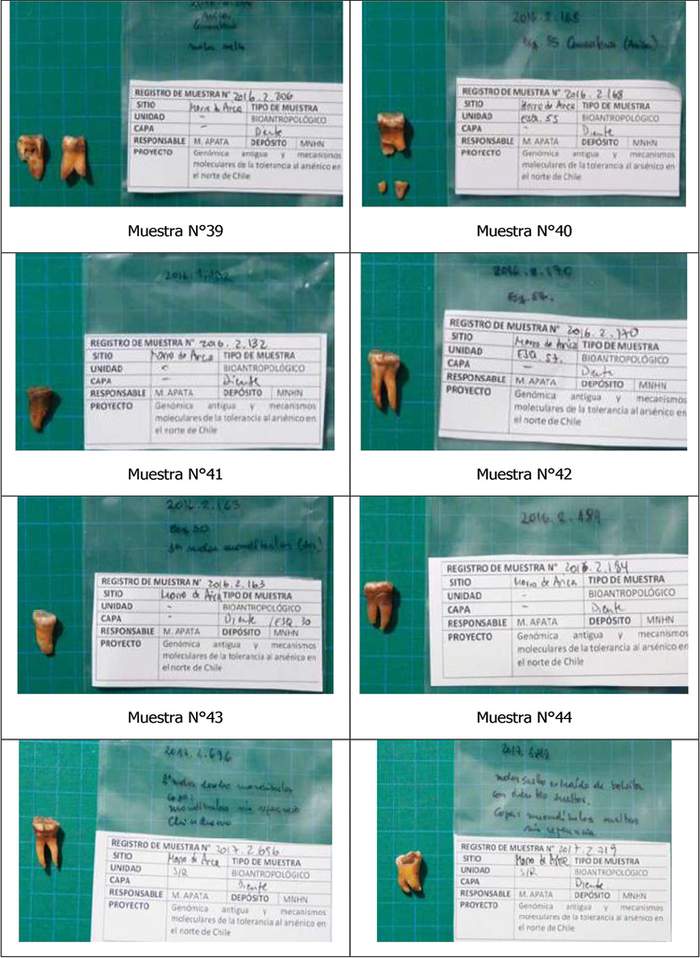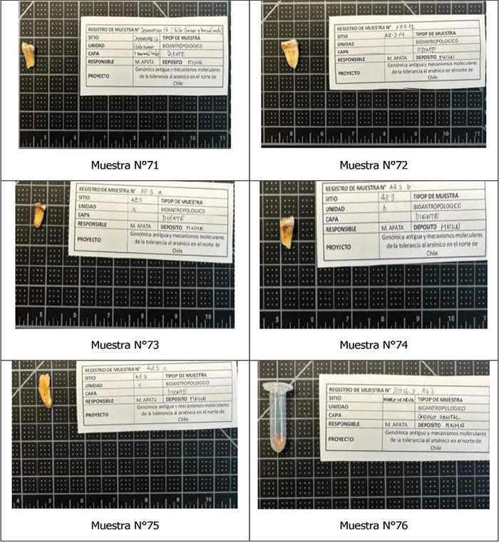 Artículo 4°: Autorízase la extracción desde el territorio nacional, a contar de la fecha de publicación del presente decreto, de 106 muestras arqueológicas al extranjero, con destino a la Universidad Estatal de Arizona, Estados Unidos, en el marco de investigación por genómica antigua y mecanismos moleculares de la tolerancia al arsénico en el norte de Chile. La salida de las muestras fue solicitada por Mario Andrés Apata Mamani y que a continuación se individualizan: