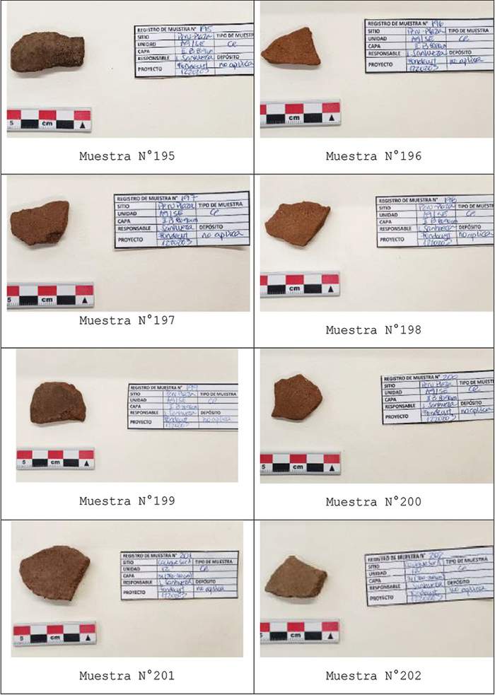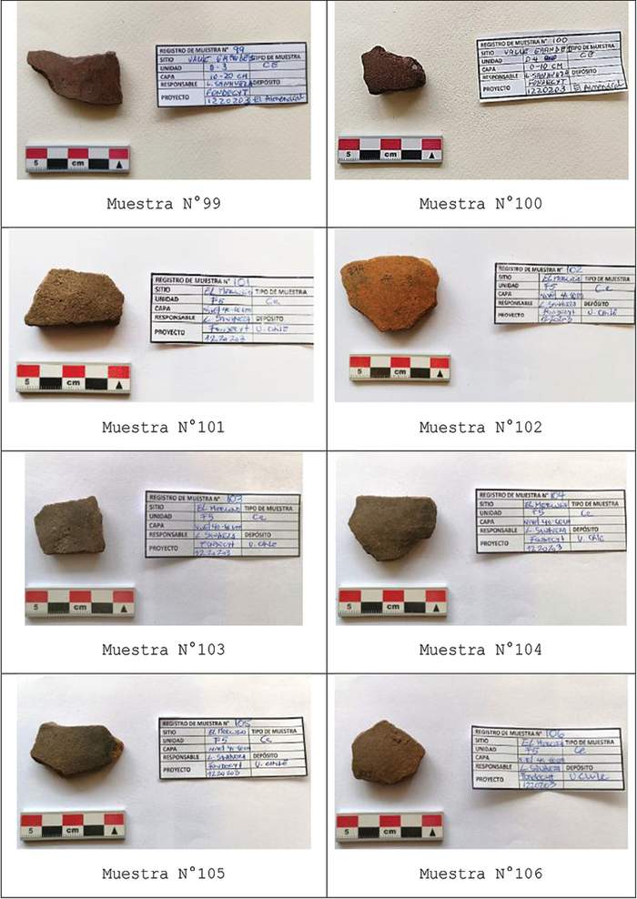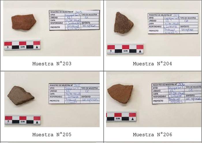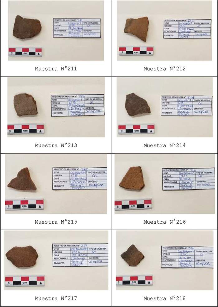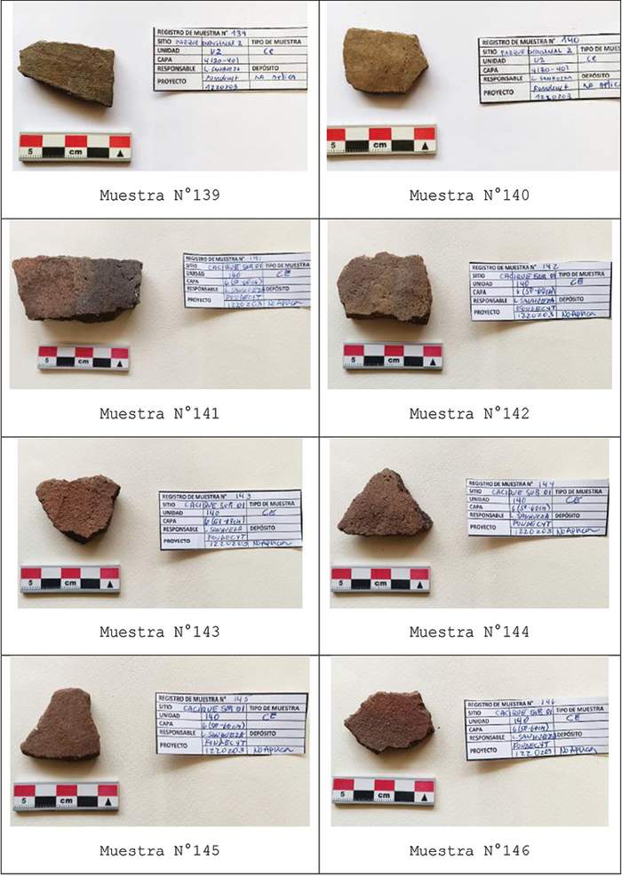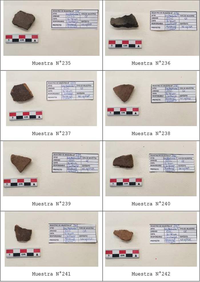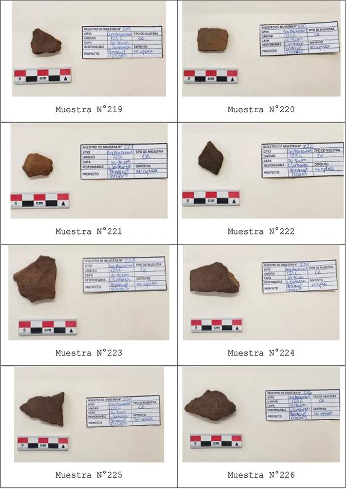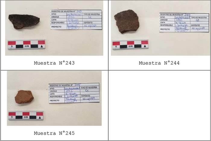Artículo 3°: Autorízase la extracción desde el territorio nacional, a contar de la fecha de publicación del presente decreto, de 155 muestras arqueológicas, correspondientes a fragmentos cerámicos provenientes de la cuenca de Santiago, Región Metropolitana, en el marco del proyecto Fondecyt 1220203 "Ocupación prehispana en torno al Totoral. Patrón de asentamiento y uso de recursos en la Laguna de Batuco". La salida de las muestras fue solicitada por María Lorena Sanhueza Riquelme y a continuación se individualizan: