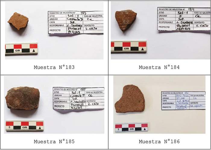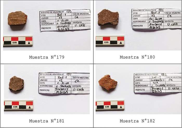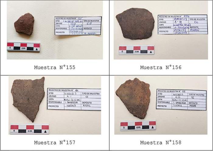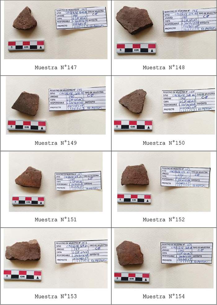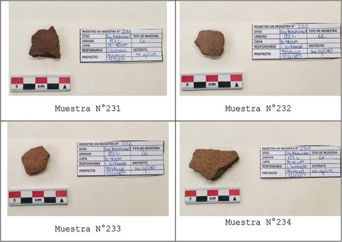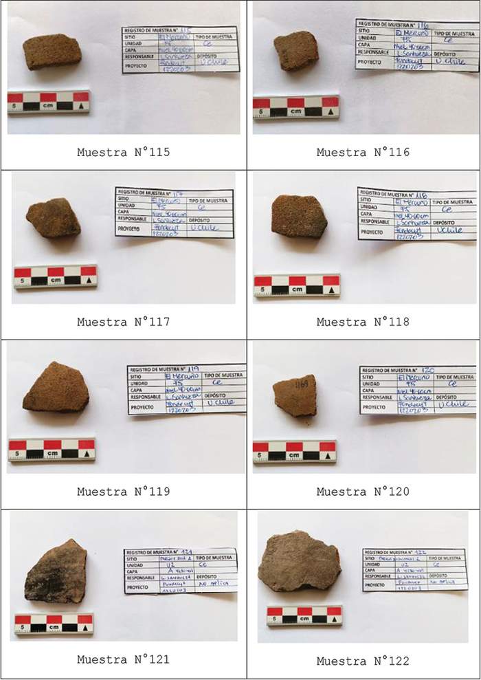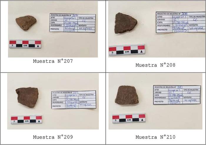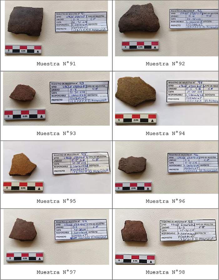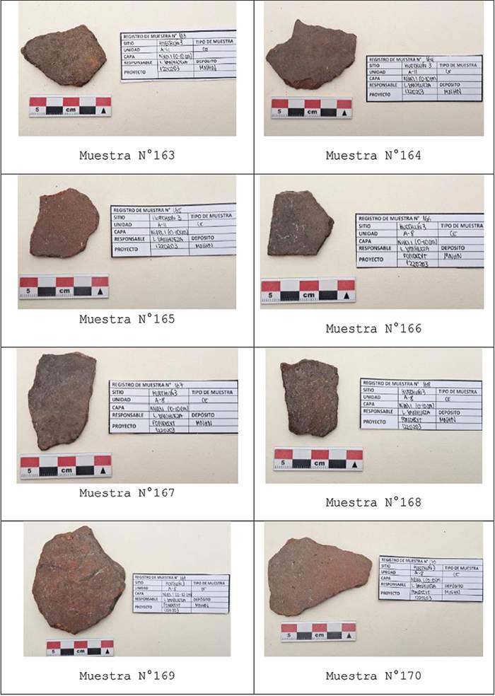 Artículo 3°: Autorízase la extracción desde el territorio nacional, a contar de la fecha de publicación del presente decreto, de 155 muestras arqueológicas, correspondientes a fragmentos cerámicos provenientes de la cuenca de Santiago, Región Metropolitana, en el marco del proyecto Fondecyt 1220203 "Ocupación prehispana en torno al Totoral. Patrón de asentamiento y uso de recursos en la Laguna de Batuco". La salida de las muestras fue solicitada por María Lorena Sanhueza Riquelme y a continuación se individualizan: