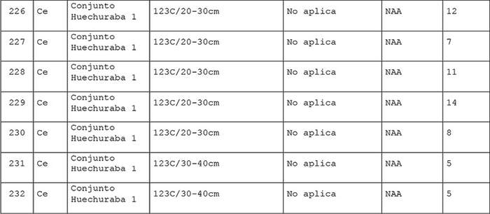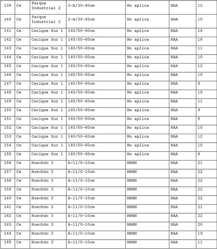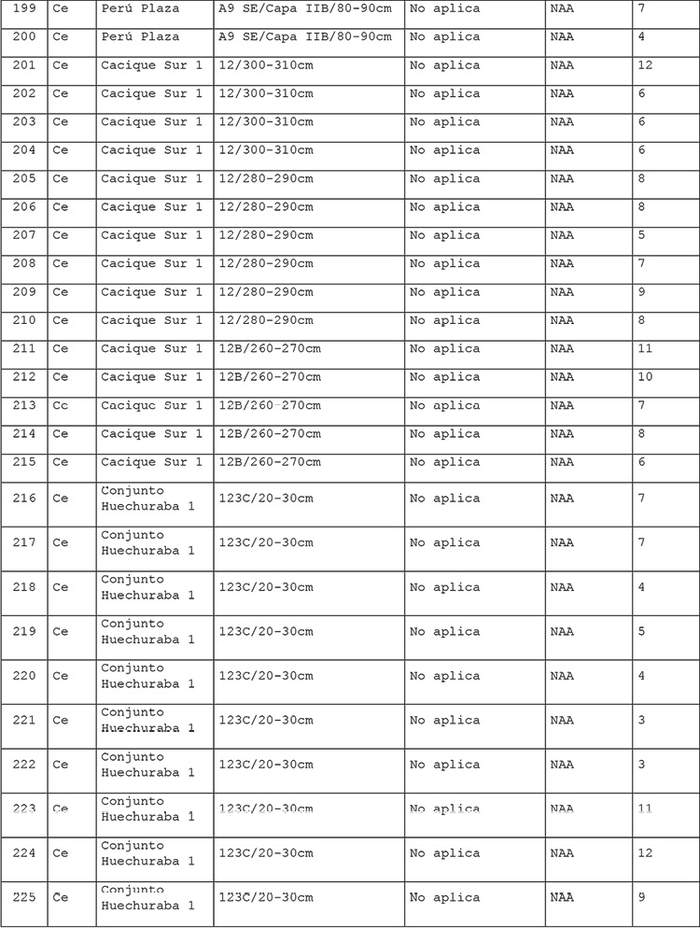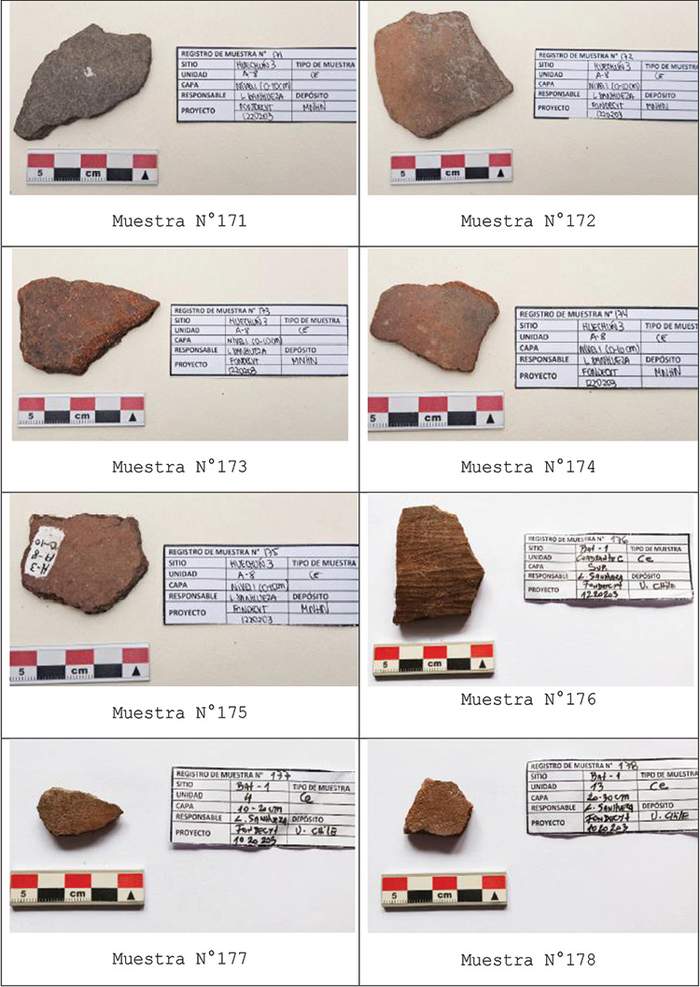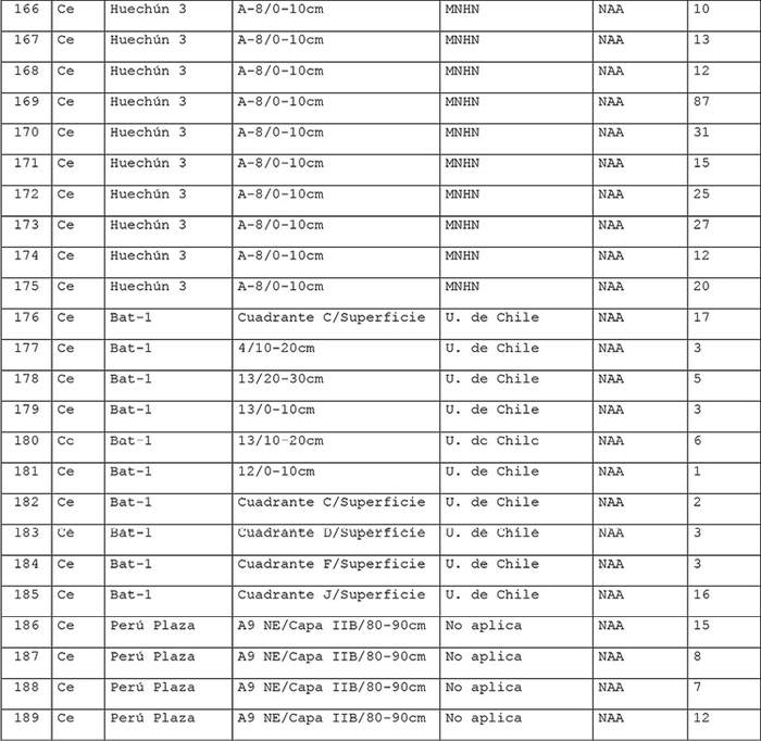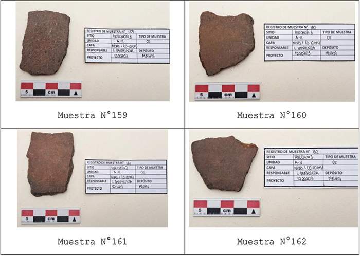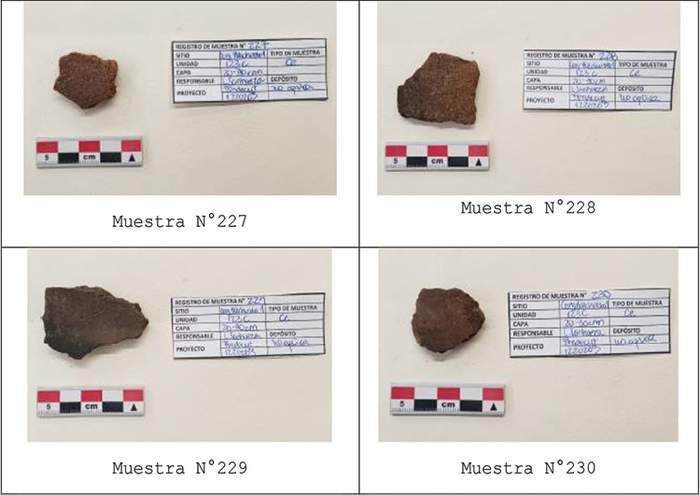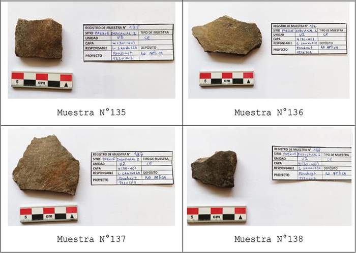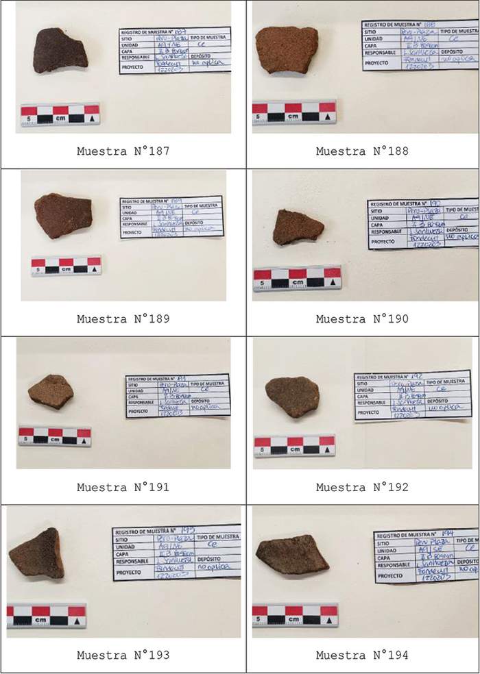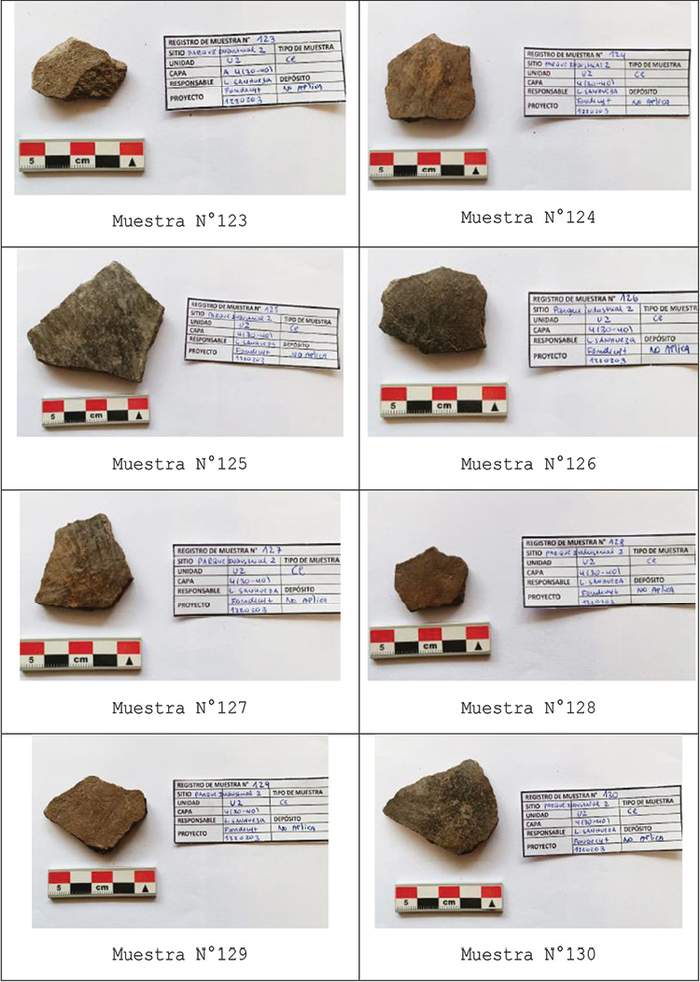 Artículo 3°: Autorízase la extracción desde el territorio nacional, a contar de la fecha de publicación del presente decreto, de 155 muestras arqueológicas, correspondientes a fragmentos cerámicos provenientes de la cuenca de Santiago, Región Metropolitana, en el marco del proyecto Fondecyt 1220203 "Ocupación prehispana en torno al Totoral. Patrón de asentamiento y uso de recursos en la Laguna de Batuco". La salida de las muestras fue solicitada por María Lorena Sanhueza Riquelme y a continuación se individualizan: