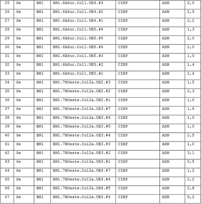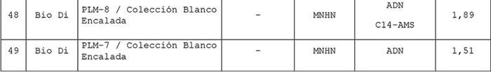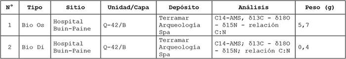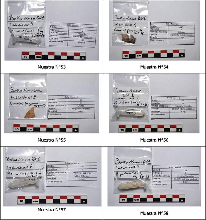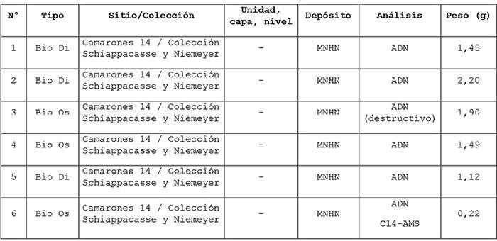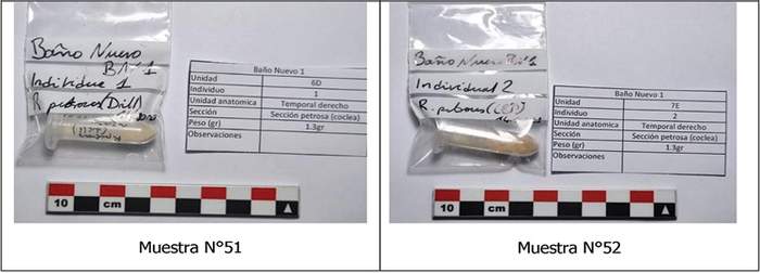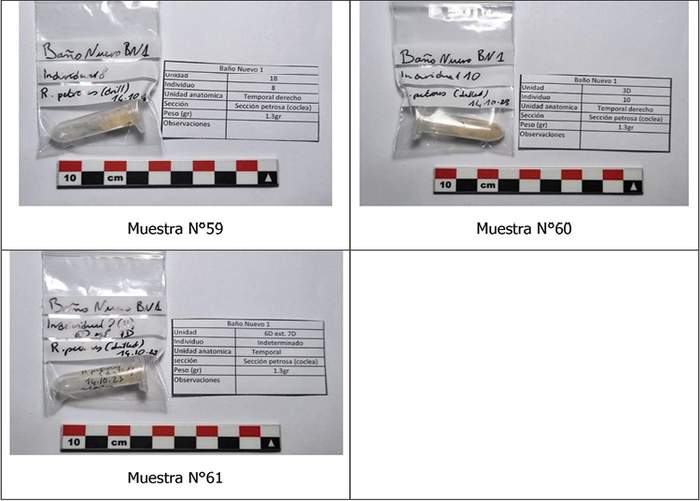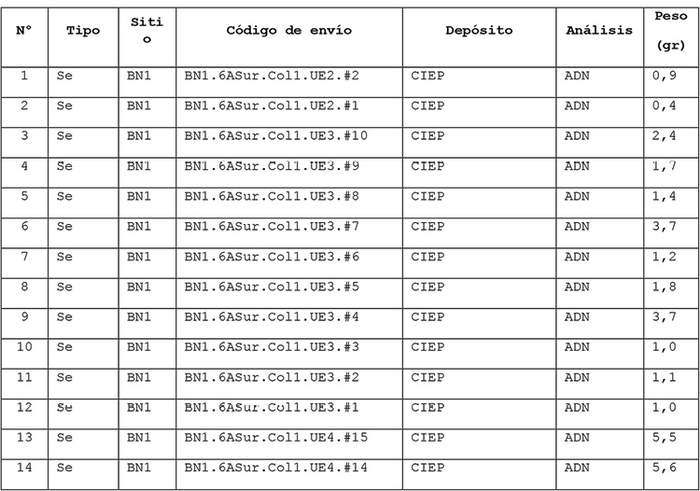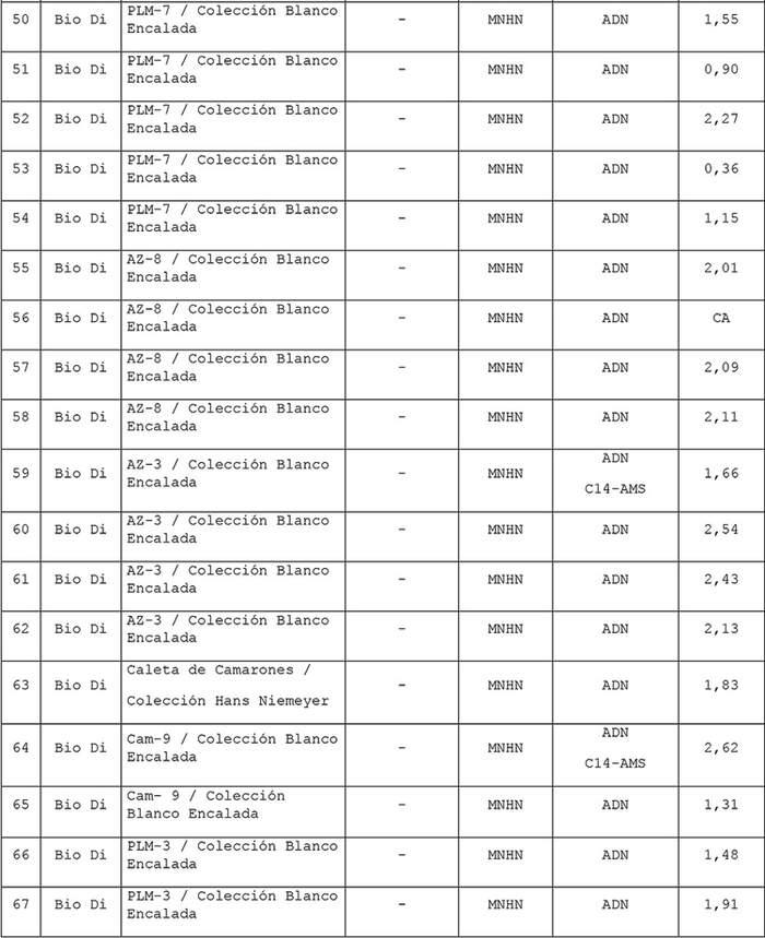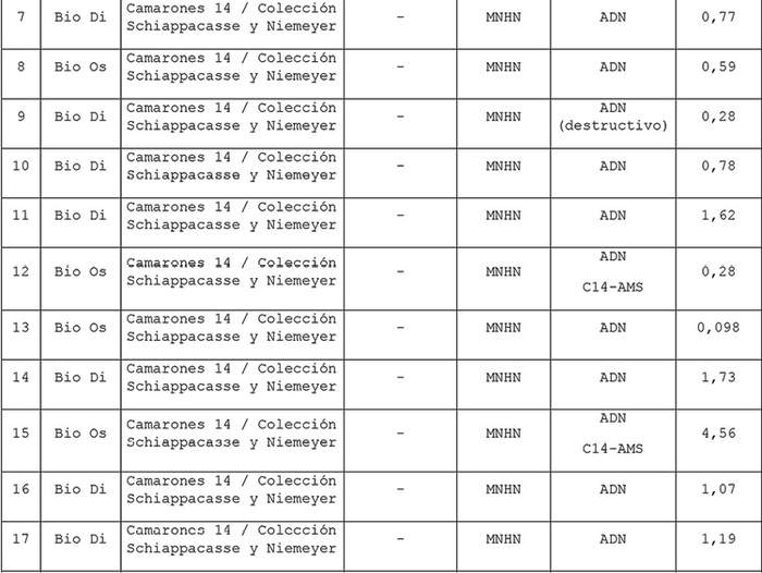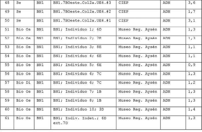 Artículo 8°: Autorízase la extracción desde el territorio nacional, a contar de la fecha de publicación del presente decreto, de 61 muestras arqueológicas (50 muestras de sedimento y 11 muestras óseas bioantropológicas) obtenidas del sitio Baño Nuevo 1 (BN1), en la Región de Aysén. Las muestras, actualmente depositadas en el Centro de Investigación en Ecosistemas de la Patagonia (CIEP) y en el Museo Regional de Aysén, serán trasladadas al Pinhasi Laboratory del Department of Evolutionary Anthropology de la Universidad de Viena, en Austria, donde serán sometidas a análisis destructivos de ADN. La salida de las muestras fue solicitada por César Méndez M. y que a continuación se individualizan: