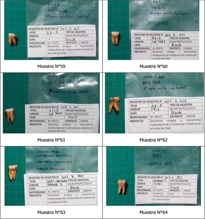 5) Que, don Mario Andrés Apata Mamani, del Institute of Human Origins, School Life of Sciences, Arizona State University, solicitó permiso para salida de 106 muestras arqueológicas al extranjero, con destino a la Universidad Estatal de Arizona, Estados Unidos (Ingreso CMN N°6398-2023), correspondientes a 66 piezas dentales, 2 fragmentos de piezas dentales, 9 falanges y 29 muestras de cálculo dental), provenientes de sitios arqueológicos costeros del Norte Grande de Chile, actualmente custodiadas por el Museo Nacional de Historia Natural (MNHN). Las muestras serán trasladadas a la Universidad de Arizona, en la ciudad de Tempe, Estados Unidos, donde serán sometidas a análisis no destructivos de ADN antiguo. 8 muestras dentales serán eventualmente sometidas a análisis destructivos de datación por C14, por lo que fueron escaneadas en formato 3D.