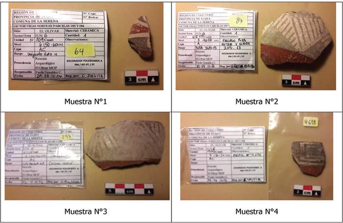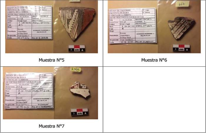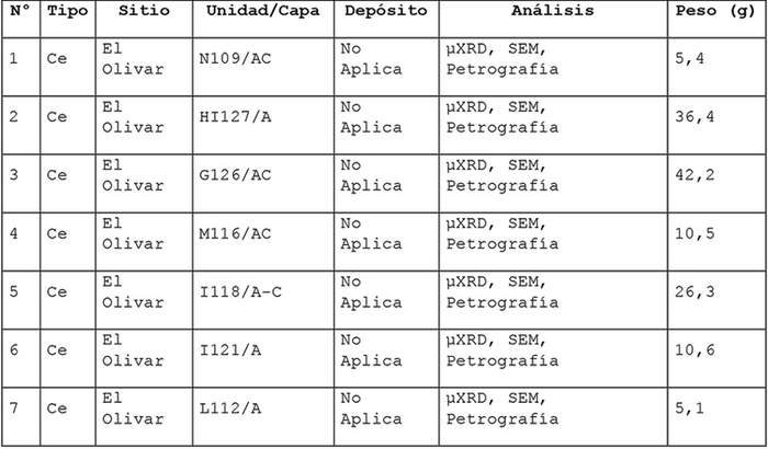 Artículo 5°: Autorízase la extracción desde el territorio nacional, a contar de la fecha de publicación del presente decreto, de 7 fragmentos cerámicos procedentes de las excavaciones de rescate arqueológico del sitio El Olivar, realizadas en el marco del proyecto "Mejoramiento Ruta 5 Tramo La Serena-Vallenar" del MOP, análisis que se enmarcan en una colaboración entre el proyecto mencionado y la tesis doctoral que desarrolla en UCL la arqueóloga Andrea Martínez, "State Control of Production, Distribution, and Consumption of Inka-style pottery in the Southern Border of Tawantinsuyu (Inka State)". La salida de las muestras fue solicitada por Paola González Carvajal y que a continuación se individualizan: