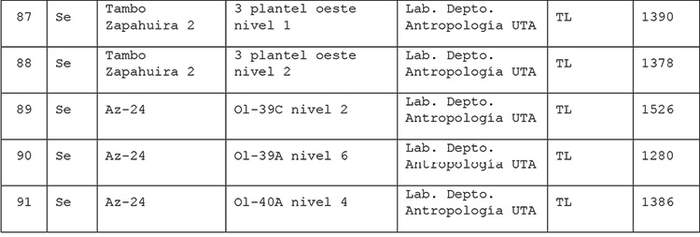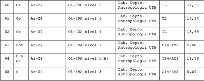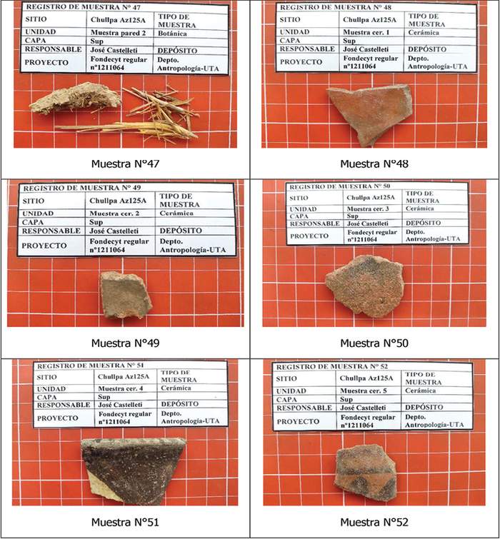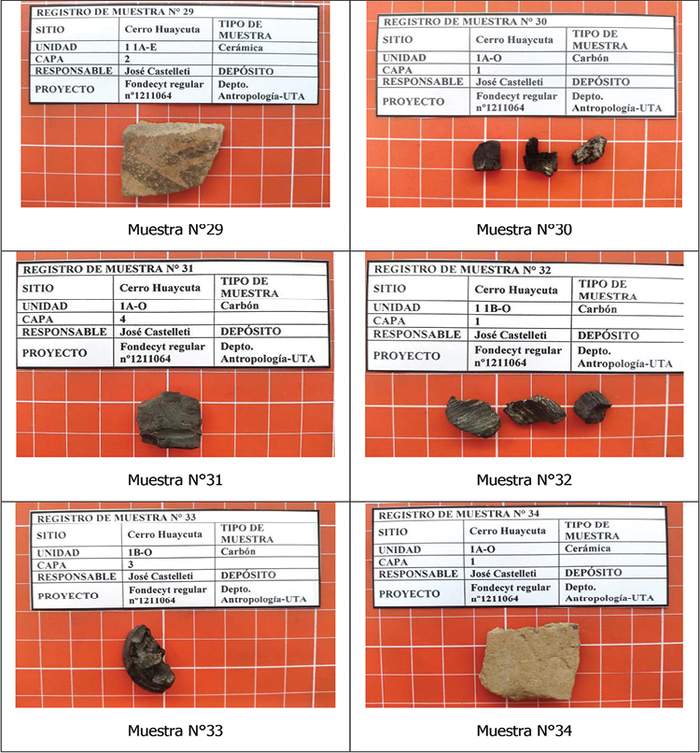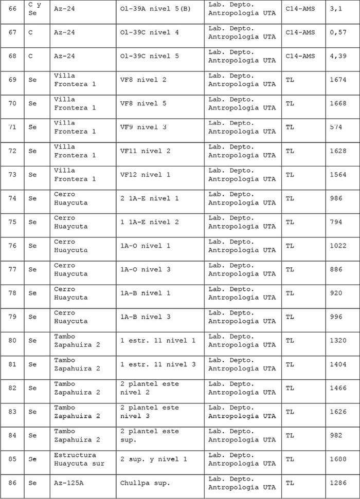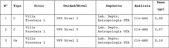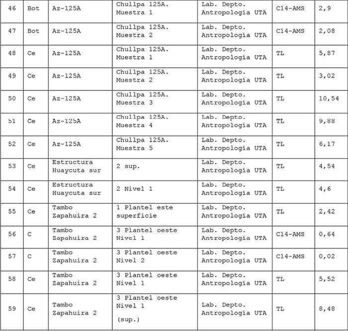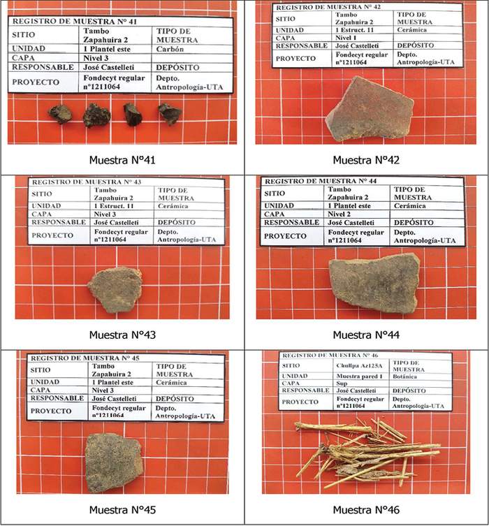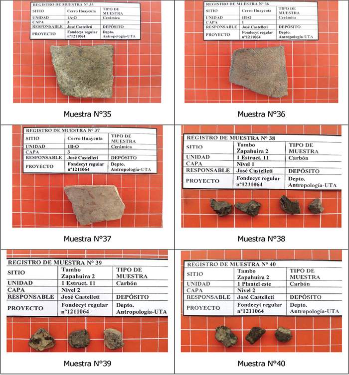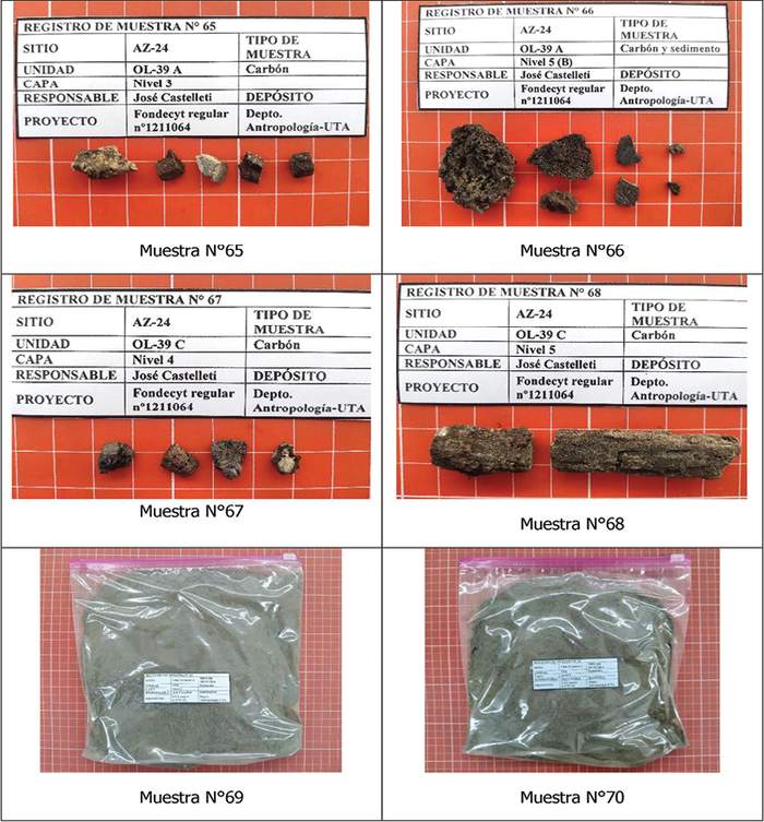 7) Que, don José Casteletti D., arqueólogo, solicitó permiso para enviar al extranjero 91 muestras para fechamiento en instituciones acreditadas (Ingreso CMN N° 6245-2023) consistentes en (28 cerámicas, 27 de carbón, 10 malacológicas, 3 botánicas y 23 de sedimento), recuperadas de los sitios Villa Frontera 1, Tambo Zapahuira 2, Chullpa Az-125A, Estructura Huaycuta sur, Cerro Huaycuta y Az-24, en la Región de Arica y Parinacota. Del total de muestras, 21 de carbón, 10 malacológicas y 3 botánicas serán trasladadas al Laboratorio Nacional de Espectrometría de Masas con Aceleradores (LEMA), Instituto de Física, Universidad Nacional Autónoma de México (UNAM), donde serán sometidas a análisis destructivos de fechado por carbono 14 mediante espectrometría de masas con aceleradores de partículas (C14-AMS). Por su parte, 6 muestras de carbón serán enviadas al laboratorio Beta Analytic, en la ciudad de Miami, Estados Unidos, para la realización de análisis destructivos de C14-AMS. Finalmente, las muestras cerámicas y de sedimento se enviarán al Laboratório de Metrologia das Radiações Ionizantes (LMRI) / Laboratório de Proteção Radiológica (LPR), Departamento de Energia Nuclear (DEN), Universidade Federal de Pernambuco (UFPE), en Recife, Brasil, para análisis destructivos de fechado por termolumniscencia (TL).