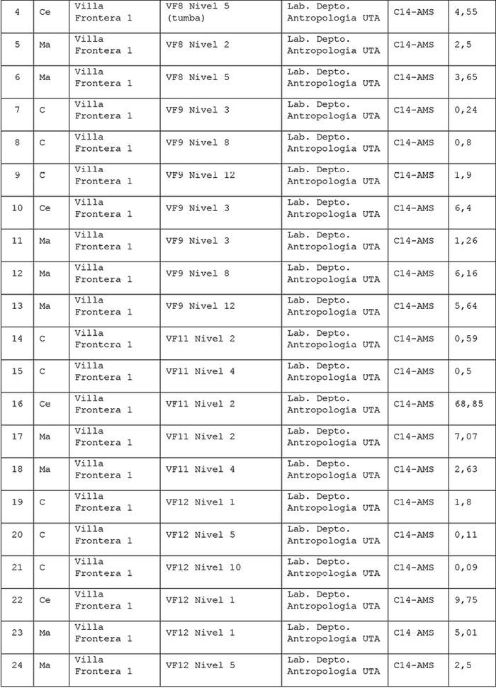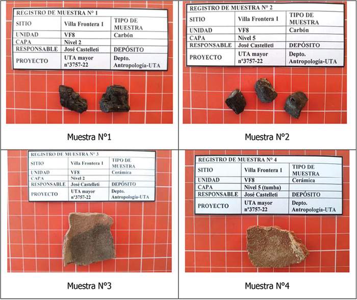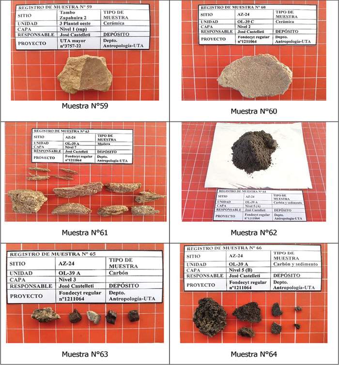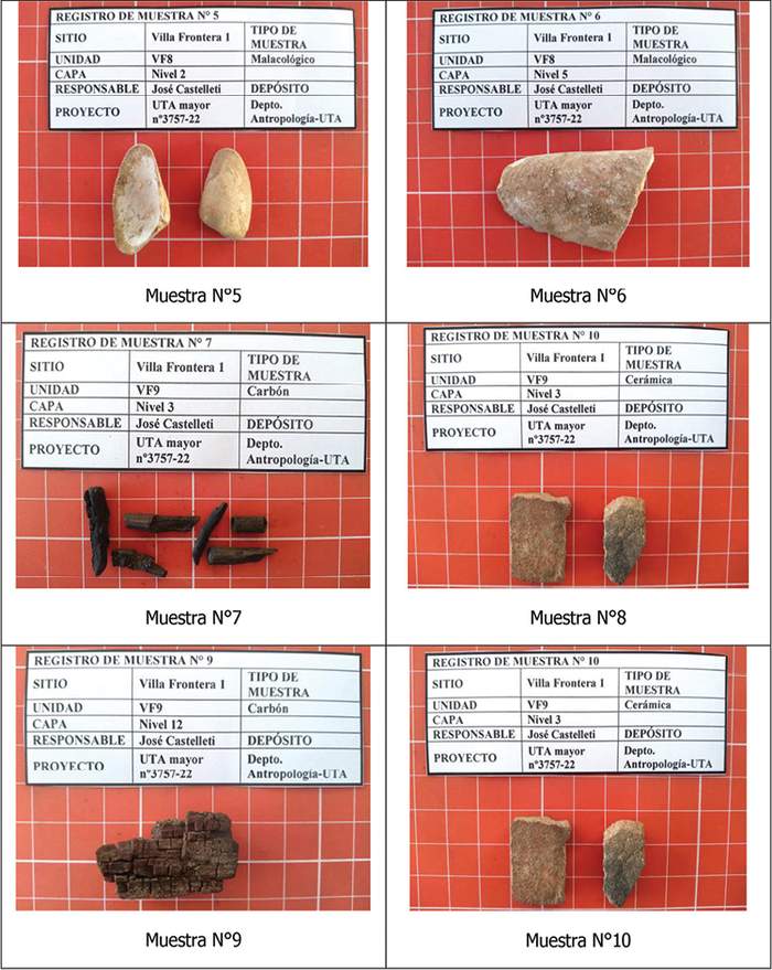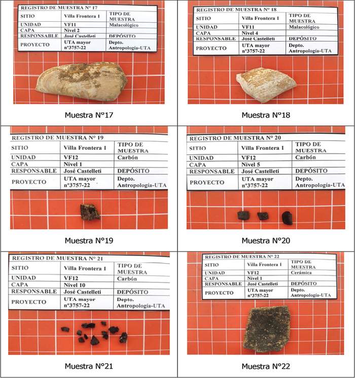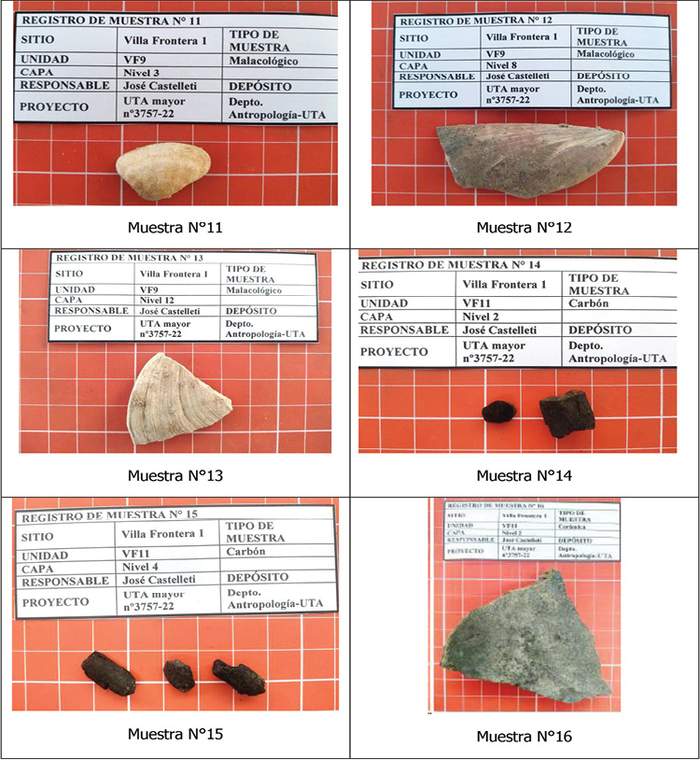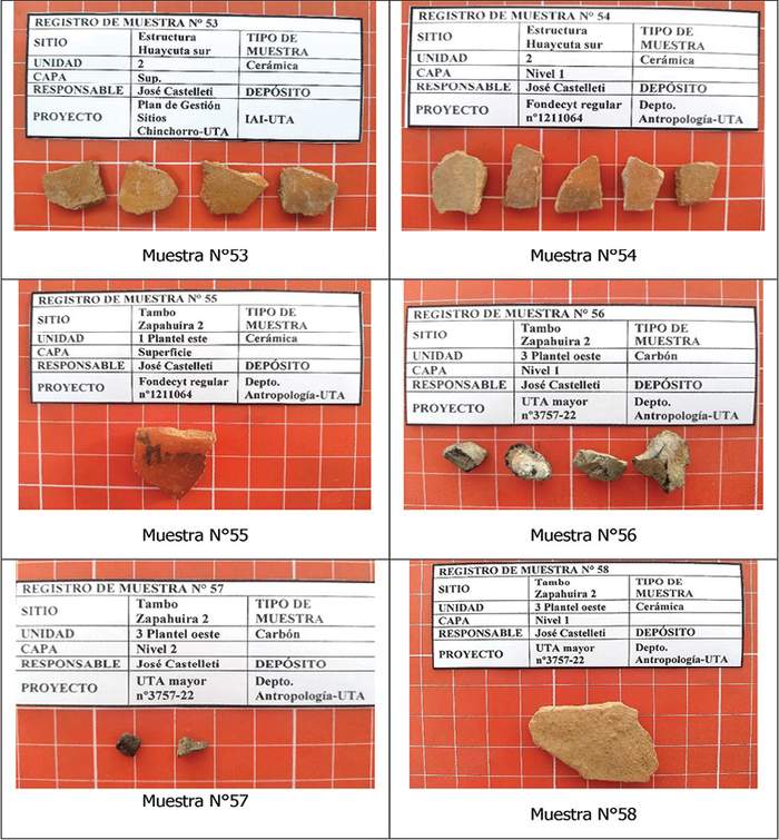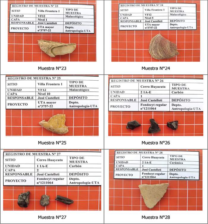 Artículo 6°: Autorízase la extracción desde el territorio nacional, a contar de la fecha de publicación del presente decreto, de al extranjero 91 muestras para fechamiento en instituciones acreditadas, recuperadas de los sitios Villa Frontera 1, Tambo Zapahuira 2, Chullpa Az-125A, Estructura Huaycuta sur, Cerro Huaycuta y Az-24, en la Región de Arica y Parinacota, en el marco de los proyectos de investigación Fondecyt regular N°1211064 "Camino del Inca en la precordillera de Arica, estudio etnoarqueológico sobre los espacios internodales y el paisaje cultural andino" y UTA mayor N° 3757-22 "Sondeo y caracterización del sitio arqueológico Villa Frontera, Arica, Región de Arica y Parinacota". La salida de las muestras fue solicitada por José Casteletti D. y que a continuación se individualizan: