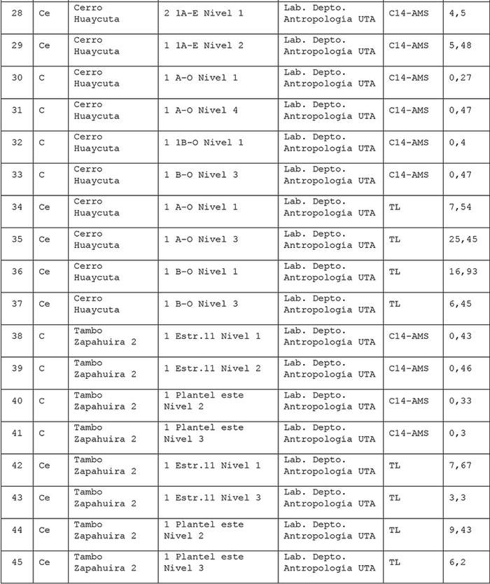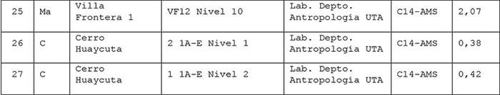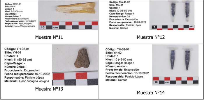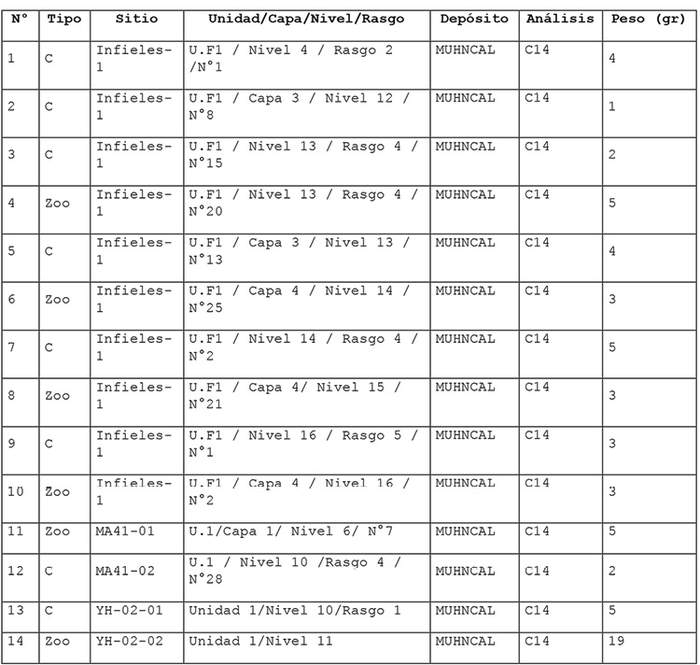 Artículo 10°: Autorízase la extracción desde el territorio nacional, a contar de la fecha de publicación del presente decreto, de 14 muestras arqueológicas al extranjero con destino al laboratorio DirectAMS, en la ciudad de Bothell, Estados Unidos, actualmente depositadas en el Museo de Historia Natural y Cultural del Desierto de Atacama (MUHNCAL), obtenidas de los sitios Infieles-1 (Salar de Infieles), MA-41 (Salar de Maricunga) y YH-02 (cuenca alta del río Jorquera), en la Región de Atacama, en el marco del proyecto Fondecyt 1190197 "Ocupaciones humanas y paisajes de altura, marco paleoambiental y geoarqueológico durante el poblamiento humano inicial en la Puna Meridional del Desierto de Atacama. La salida de las muestras fue solicitada por Patricio Gonzalo López Mendoza y a continuación se individualizan: