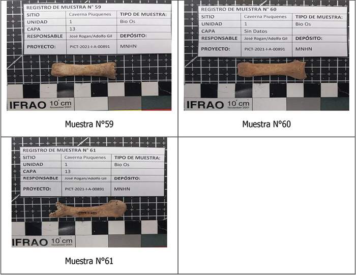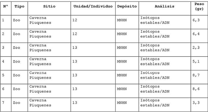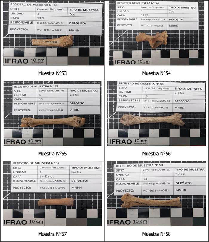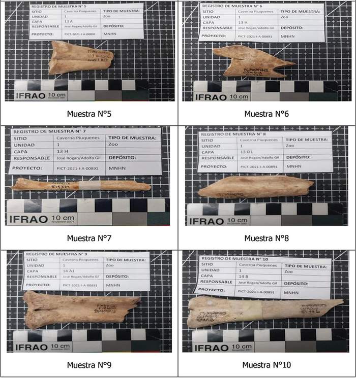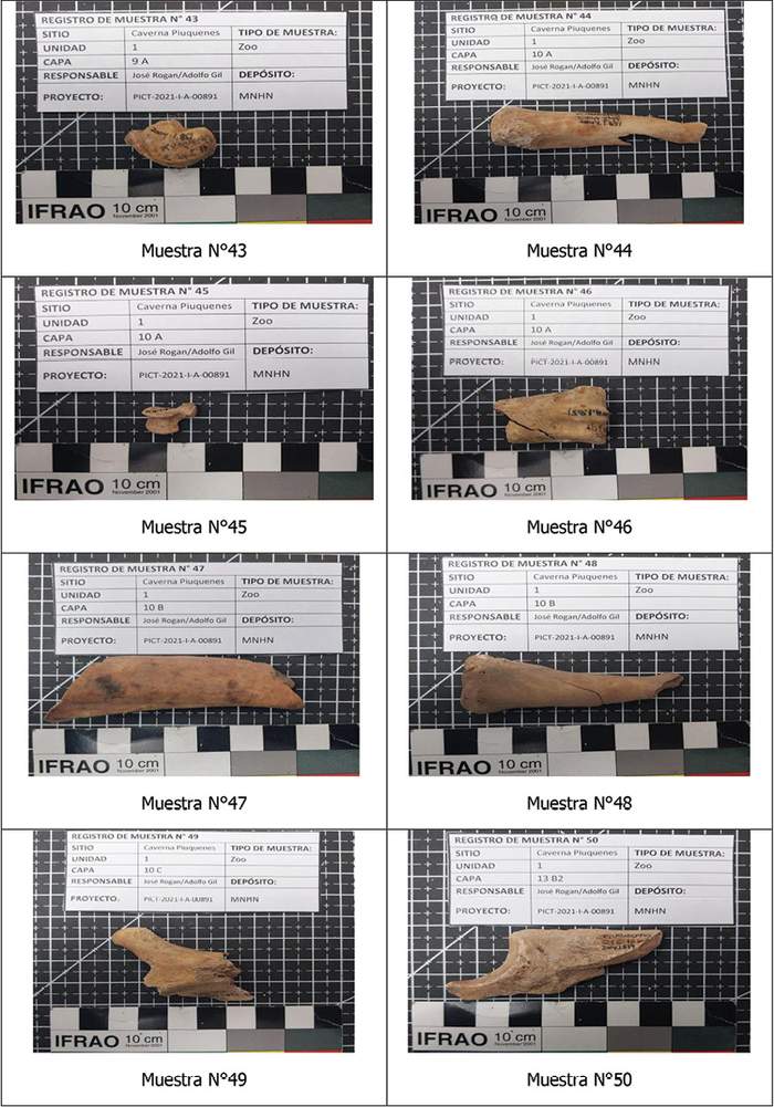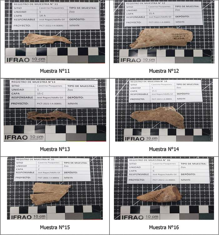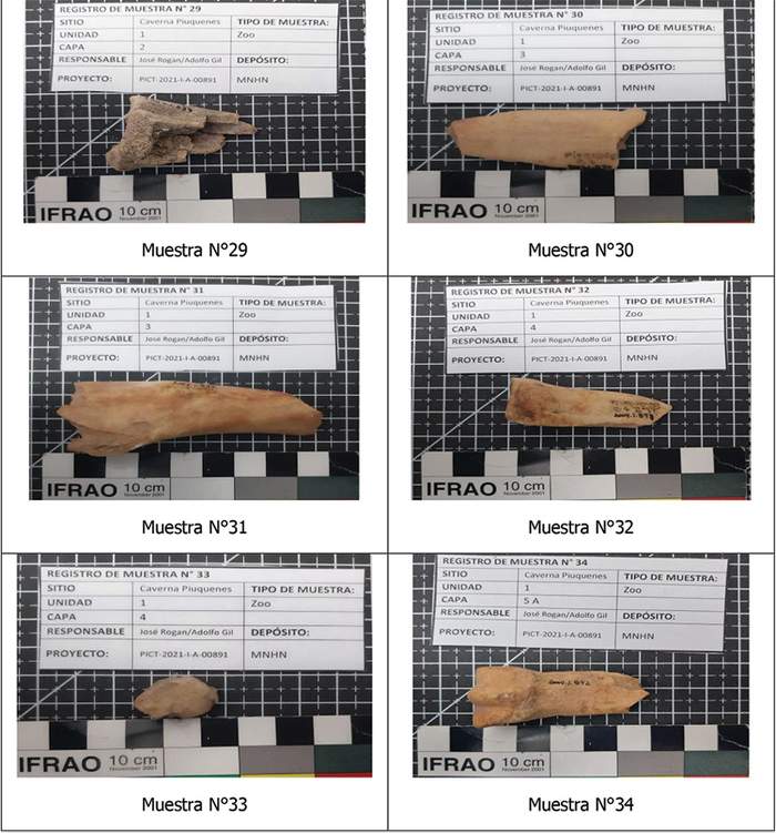 Artículo 11°: Autorízase la extracción desde el territorio nacional, a contar de la fecha de publicación del presente decreto, 61 muestras arqueológicas (54 muestras zooarqueológicas y 7 muestras óseas humanas) recuperadas en el sitio Caverna Piuquenes, en la Región de Valparaíso, en el marco del proyecto Fondecyt N° 11170010 "Paleoecología de la Dinámica Poblacional Humana en el Centro Occidente Argentino: Una exploración multiescalar, actualmente depositadas en el Museo Nacional de Historia Natural (MNHN). La salida de las muestras fue solicitada por José Andrés Rogan Benavides y que a continuación se individualizan: