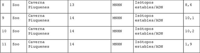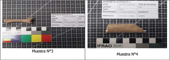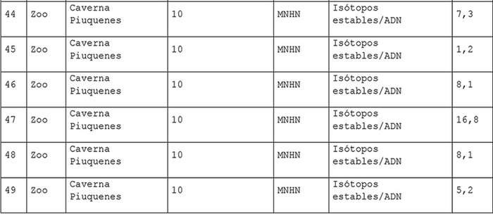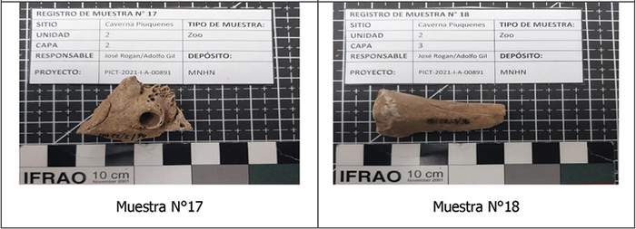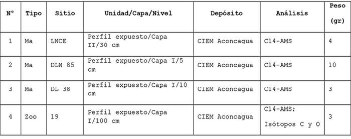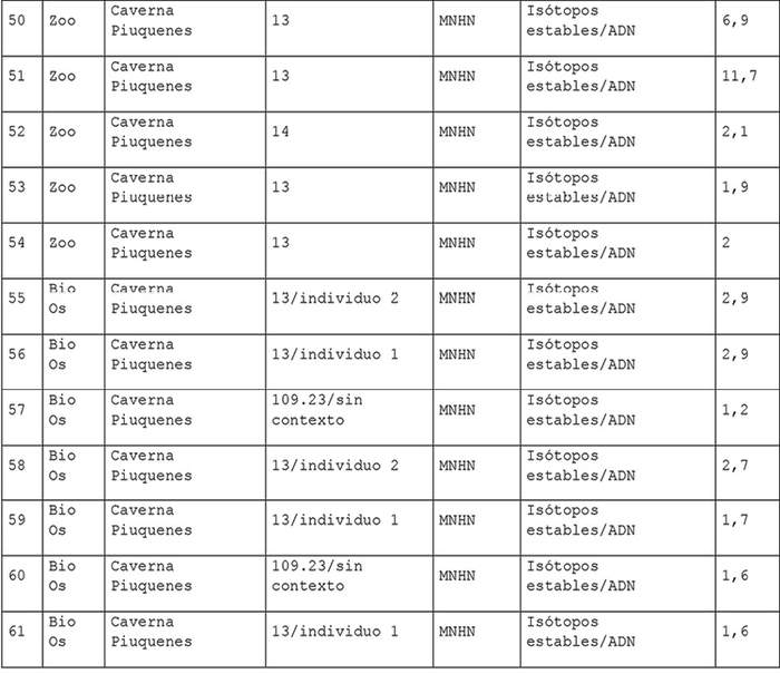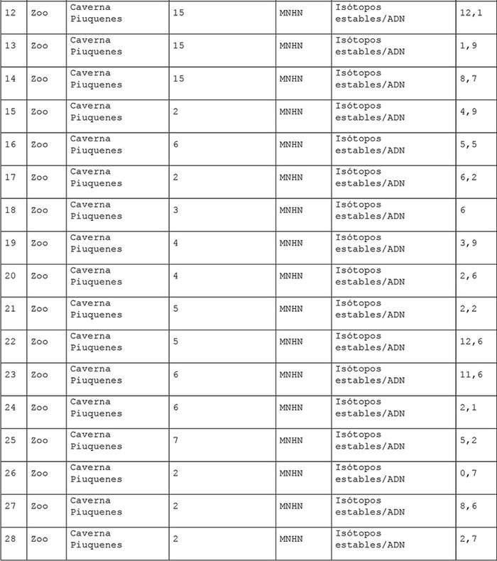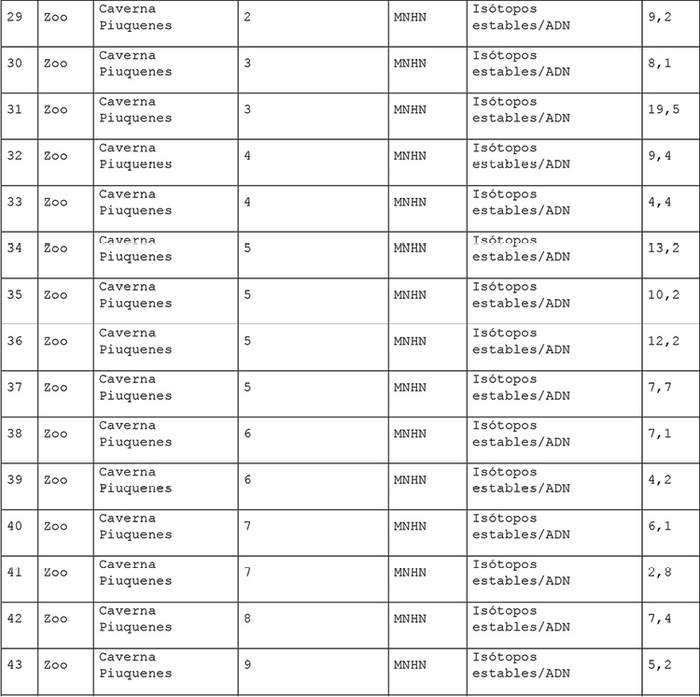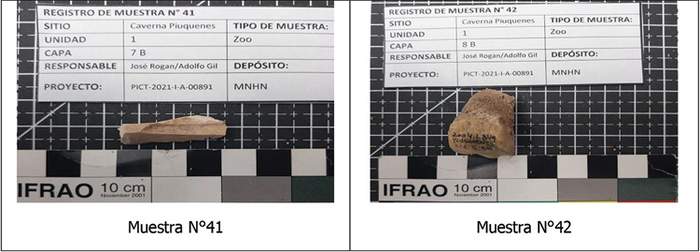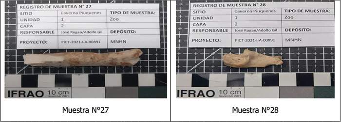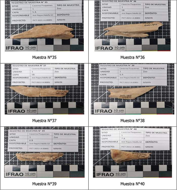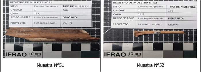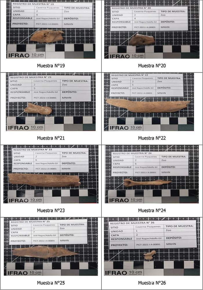 Artículo 11°: Autorízase la extracción desde el territorio nacional, a contar de la fecha de publicación del presente decreto, 61 muestras arqueológicas (54 muestras zooarqueológicas y 7 muestras óseas humanas) recuperadas en el sitio Caverna Piuquenes, en la Región de Valparaíso, en el marco del proyecto Fondecyt N° 11170010 "Paleoecología de la Dinámica Poblacional Humana en el Centro Occidente Argentino: Una exploración multiescalar, actualmente depositadas en el Museo Nacional de Historia Natural (MNHN). La salida de las muestras fue solicitada por José Andrés Rogan Benavides y que a continuación se individualizan:
