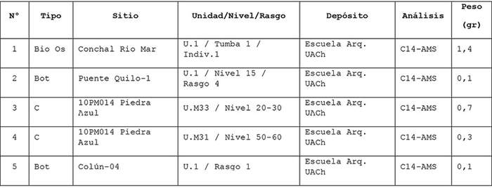 Artículo 12°: Autorízase la extracción desde el territorio nacional, a contar de la fecha de publicación del presente decreto, de 5 muestras arqueológicas (2 arqueobotánicas, 2 carbones, 1 fragmento óseo humano), recuperadas de los sitios Conchal Río Mar, Puente Quilo-1 y 10PM014 Conchal Piedra Azul (Región de Los Lagos), y del sitio Colún-04 (Región de Los Ríos), actualmente depositadas en la Escuela de Arqueología de la Universidad Austral de Chile (UACh), sede Puerto Montt. La salida de las muestras fue solicitada por Simón Gonzalo Sierralta Navarro y que a continuación se individualizan: