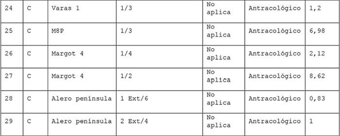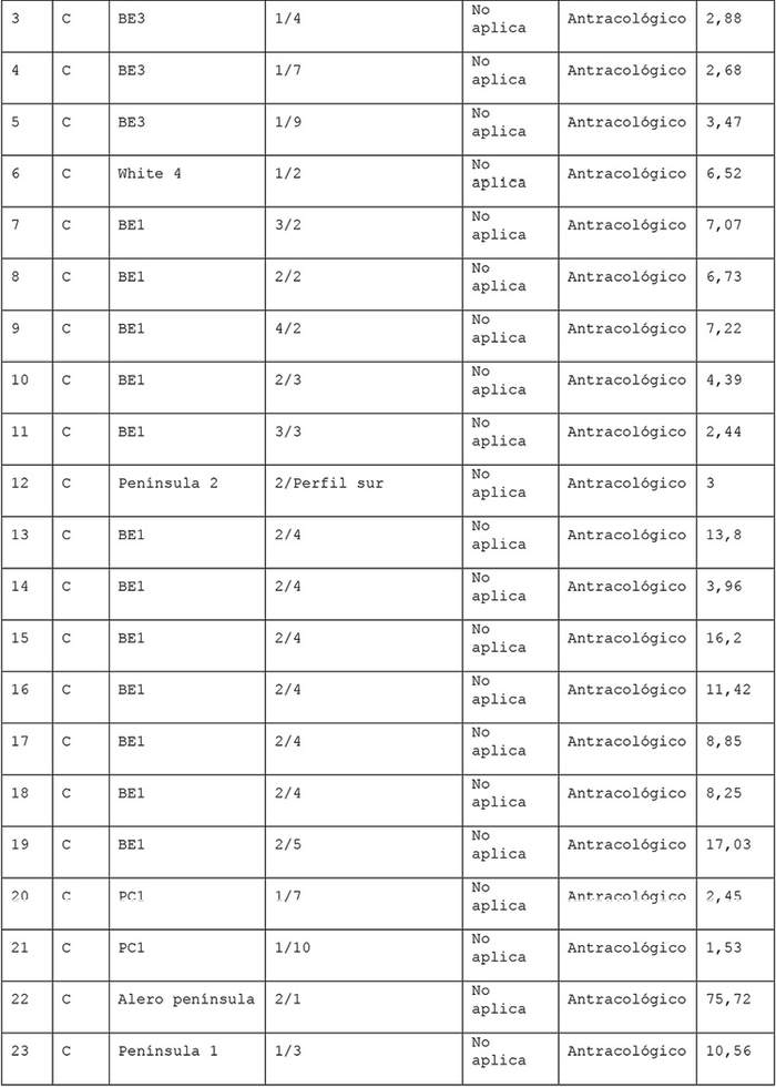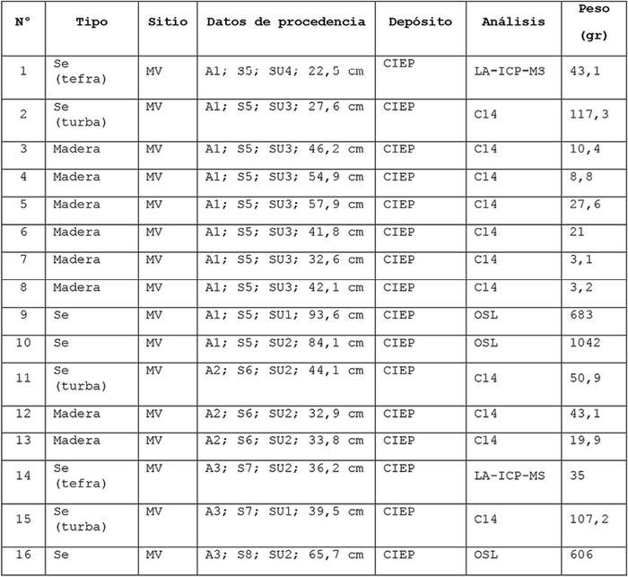 Artículo 13°: Autorízase la extracción desde el territorio nacional, a contar de la fecha de publicación del presente decreto, de 16 muestras arqueológicas (8 muestras de madera y 8 de sedimento) provenientes del sitio Monte Verde (MV), en la Región de Los Lagos, actualmente depositadas en el Laboratorio de Arqueología y Patrimonio del Centro de Investigación en Ecosistemas de la Patagonia (CIEP) y su estudio se enmarca en el proyecto ANID Regional R20F0002 "Ecosystem, climate change and socio-environmental linkages along the continental-ocean continuum. Long-term socio-ecological research in Patagonia (PATSER)". La salida de las muestras fue solicitada por César Méndez M. y que a continuación se individualizan: