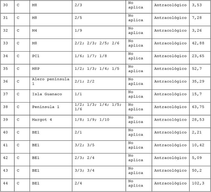 Artículo 14°: Autorízase la extracción desde el territorio nacional, a contar de la fecha de publicación del presente decreto, de 51 muestras arqueológicas que proceden de excavaciones efectuadas en la Península Antonio Varas, Isla Diego Portales e Isla Guanaco (Provincia de Última Esperanza, Región de Magallanes y Antártica Chilena), en el marco de los proyectos "Arqueología en el mar interior de Última Esperanza (Magallanes, Chile): navegación, intercambio y uso de recursos vegetales durante el Holoceno tardío" y "Nomads of the Inland Sea: maritime hunter-gatherer mobility and social interaction in a Southern Patagonian mixed environment", financiados por la Fundación Palarq (España) y Wenner Gren Foundation (Estados Unidos), y patrocinados por la Universidad Autónoma de Barcelona y la Universidad de Magallanes. La salida de las muestras fue solicitada por Christian García Pérez y a continuación se individualizan: