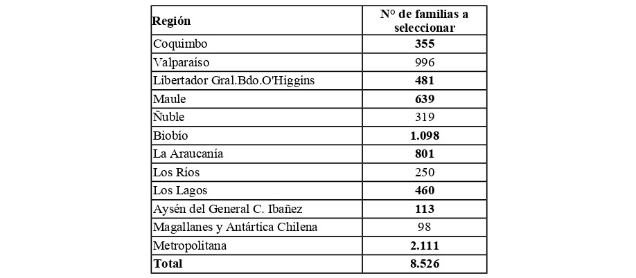 4. La cantidad de familias a seleccionar se distribuirá regionalmente según la tabla que se presenta a continuación, pudiendo practicarse redistribuciones o modificaciones de recursos que serán sancionadas mediante resolución: