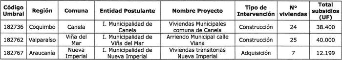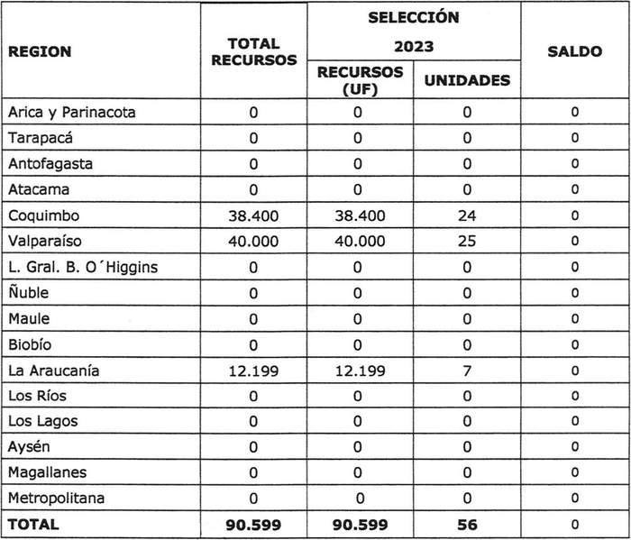 2. Apruébase la selección de los proyectos indicados en la siguiente tabla, con su respectivo financiamiento total, del llamado efectuado por la resolución exenta Nº 1.353 (V. y U.), de 2023, mediante el otorgamiento de subsidios del Programa Habitacional Fondo Solidario de Elección de Vivienda, regulado por el DS Nº 49 (V. y U.), de 2011 y sus modificaciones, conforme a la letra h) de la Glosa 03 de Vivienda asociada al subtítulo 33, ítem 01, de la Ley de Presupuestos del sector público del año 2023, el cual incluye los montos por concepto de servicios de asistencia técnica, fiscalización técnica de obras y pago de aranceles del Conservador de Bienes Raíces, imputándose dichos montos al programa señalado, correspondiente al año 2023 para cada una de dichas regiones: