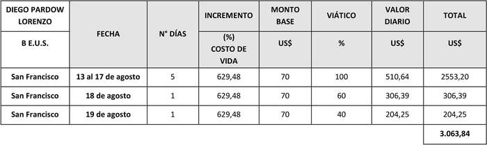 II. Déjase establecido que, el señor Ministro de Energía tendrá derecho a pasajes aéreos por los tramos Santiago - Denver - Seattle - Sacramento - San Francisco - Santiago y un viático diario de US$ 70 (setenta dólares), en razón del 100% por los días 13 al 17 de agosto de 2023, en razón del 60% por el día 18 de agosto, en razón del 40% por el día 19 de agosto de 2023, incrementado al 629,48% de acuerdo al costo de vida en San Francisco, Estados Unidos, en relación al siguiente detalle:Resolución 2,