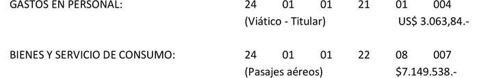 IV. Impútese el gasto por viático que demanda esta comisión de servicio al extranjero, en dólares, en su equivalente en moneda nacional, y el gasto por pasajes aéreos, ambos correspondientes al presupuesto vigente de la Subsecretaría de Energía, ítem:Resolución 2,