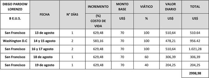 II. Déjase establecido que el señor Ministro de Energía tendrá derecho a pasajes aéreos por los tramos Santiago - Denver - Seattle - Sacramento - San Francisco - Santiago y un viático diario de US$ 70 (setenta dólares), en razón del 100% por los días 13, 16 y 17 de agosto de 2023, en razón del 60% por el día 18 de agosto, en razón del 40% por el día 19 de agosto de 2023, incrementado al 629,48% de acuerdo al costo de vida en San Francisco, Estados Unidos y en razón del 100% por los días 14 y 15 de agosto de 2023, incrementado al 583,16% de acuerdo al costo de Washington D.C., Estados Unidos; en relación al siguiente detalle: