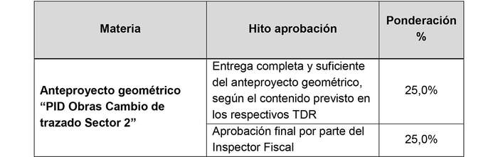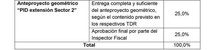 3.3.1 El monto por concepto del desarrollo del Anteproyecto Geométrico que forma parte de los "PID Obras cambio de trazado Sector 2" y "PID extensión del Sector 2", señalado en el numeral 2.1 del presente Convenio, será reconocido el último día del mes conforme a los porcentajes indicados en el siguiente cuadro: