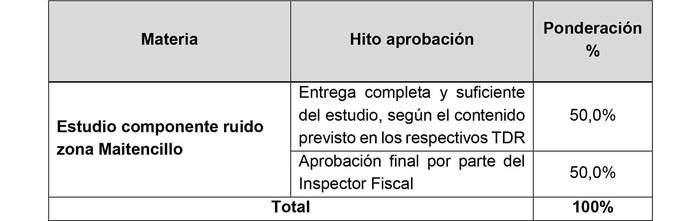 Sin perjuicio de lo anterior, en el evento que al último día hábil del mes de marzo de 2024 el "Estudio Componente Ruido Zona Maitencillo" no hubiera sido aprobado por parte del Inspector Fiscal, por causas no atribuibles a responsabilidad de la Sociedad Concesionaria, el monto correspondiente a la aprobación final será reconocido en dicha fecha.