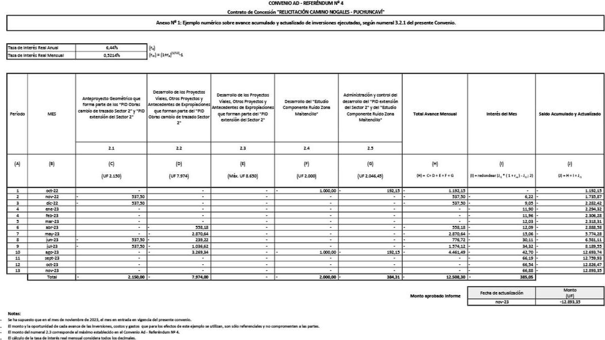 Para una mejor comprensión del procedimiento señalado en el presente numeral, se adjunta como Anexo N° 1, un ejemplo numérico sobre el avance acumulado y actualizado de las inversiones, gastos y costos ejecutados hasta el último día del mes calendario de entrada en vigencia del presente Convenio.