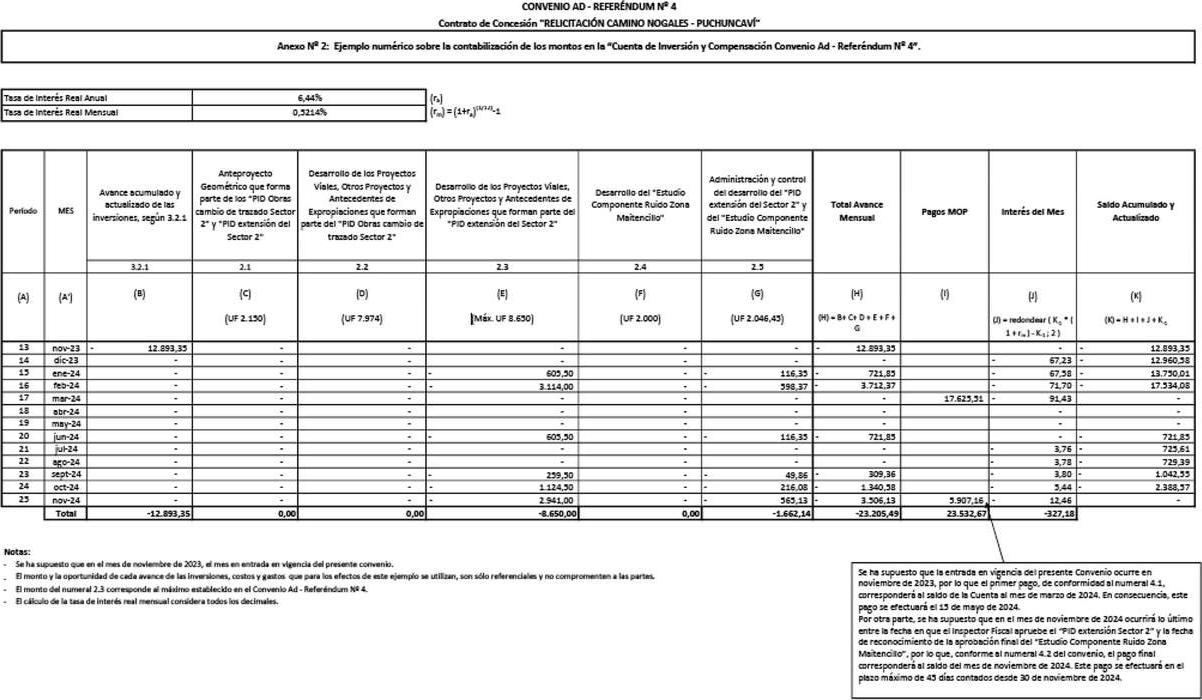 Una vez aprobado el informe y documentos de respaldo por parte del Inspector Fiscal, correspondiente al avance acumulado y actualizado hasta el último día del mes de entrada en vigencia del presente Convenio, se contabilizará, por única vez, con signo negativo, en la "Cuenta de Inversión y Compensación Convenio Ad - Referéndum N° 4", con fecha del último día del mes anterior a la entrega del informe que trata el presente numeral.