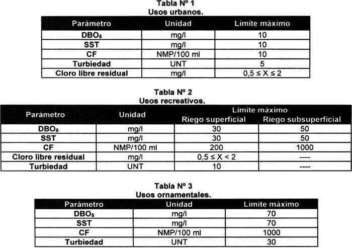 Artículo 36. En las tablas siguientes se define la calidad de las aguas grises tratadas para cada uno de los usos definidos en el artículo 8º de la ley y 34º de este reglamento.