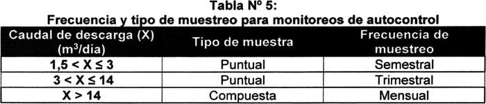 Artículo 46. La frecuencia de los monitoreos de autocontrol y el tipo de muestra, con excepción del cloro libre residual cuyo seguimiento se realizará según lo dispuesto en el artículo 45, se determinará de acuerdo con el volumen diario de aguas grises tratadas generadas, conforme se indica en la siguiente tabla: