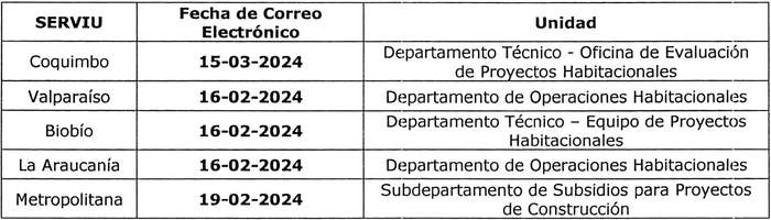 e) Que, las confirmaciones referidas en el considerando d) fueron realizadas mediante los correos electrónicos enviados por los Serviu respectivos, citados en la siguiente tabla adjunta: