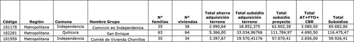 2. Apruébase la selección de los grupos organizados indicados en las siguientes tablas, con su respectivo financiamiento total, el cual incluye los servicios de asistencia técnica, fiscalización técnica de obras y aranceles del Conservador de Bienes Raíces, detallados en el Resuelvo 3., para el otorgamiento de subsidios del Programa Habitacional Fondo Solidario de Elección de Vivienda en la alternativa de postulación colectiva, para adquisición de terrenos y desarrollo de proyectos de Construcción en Nuevos Terrenos y Pequeños Condominios, correspondiente al proceso de selección cuyo cierre de postulación se efectuó el día 28 de noviembre de 2023, del llamado efectuado por resolución exenta N° 1.014 (V. y U.), de 2023: