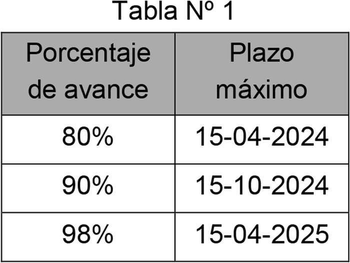 Las declaraciones de avance antes señaladas deberán cumplir, al menos, con los porcentajes de avance requeridos, y ser presentadas por la Sociedad Concesionaria al Inspector Fiscal, a más tardar, en los plazos máximos indicados en la Tabla Nº 1 siguiente.