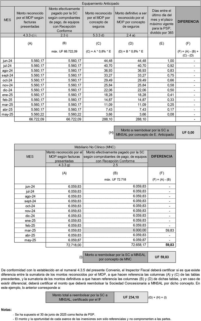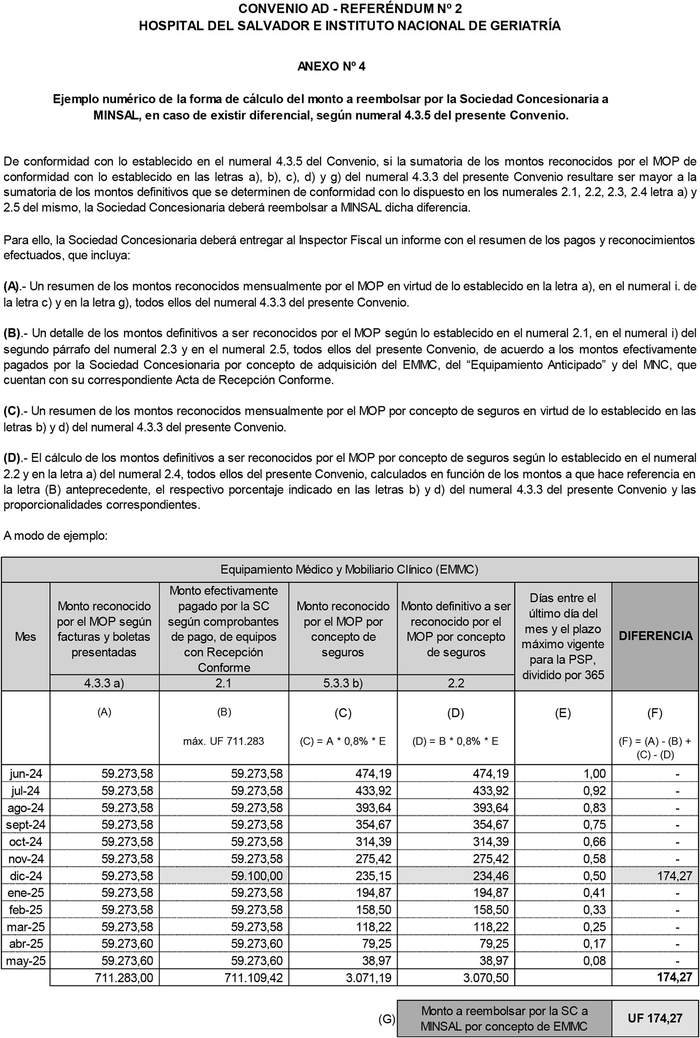 . Anexo Nº 4: Ejemplo numérico de la forma de cálculo del monto a reembolsar por la Sociedad Concesionaria a Minsal, en caso de existir diferencial, según numeral 4.3.5 del presente Convenio.