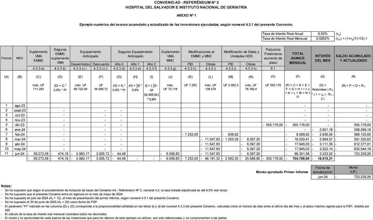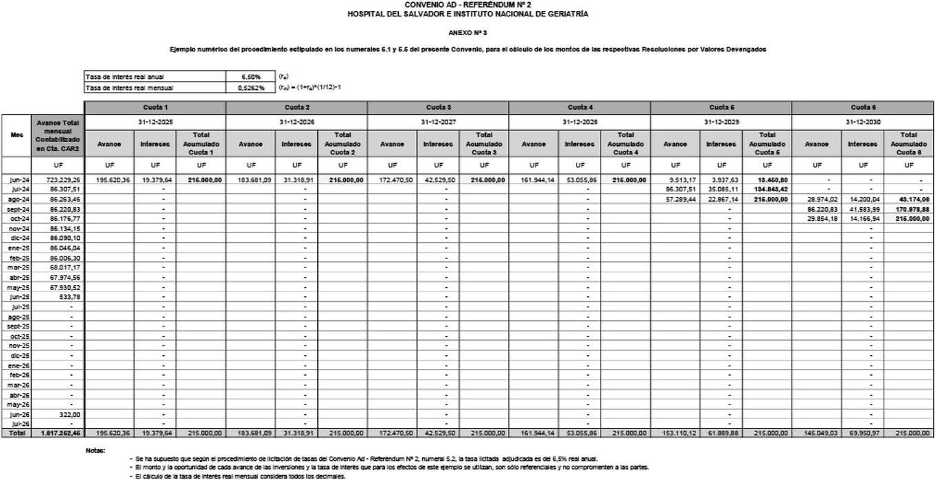 6.4 Las partes acuerdan que las cuotas del Subsidio Fijo por concepto de Adquisición y Reposición de Mobiliario No Clínico (MNC) durante la Etapa de Construcción, establecido en el artículo 1.12.2.7 de las Bases de Licitación y en el número 51 del Anexo Complementario de las Bases Administrativas, modificado de conformidad con lo dispuesto en el numeral 2.2 del Convenio Ad – Referéndum Nº 1 aprobado mediante decreto supremo MOP Nº 120 de 2018, cada una de las cuales asciende a un valor de UF 3.979 (tres mil novecientas setenta y nueve Unidades de Fomento) para el Hospital del Salvador y de UF 874 (ochocientas setenta y cuatro Unidades de Fomento) para el Instituto Nacional de Geriatría, serán pagadas de acuerdo a lo siguiente: