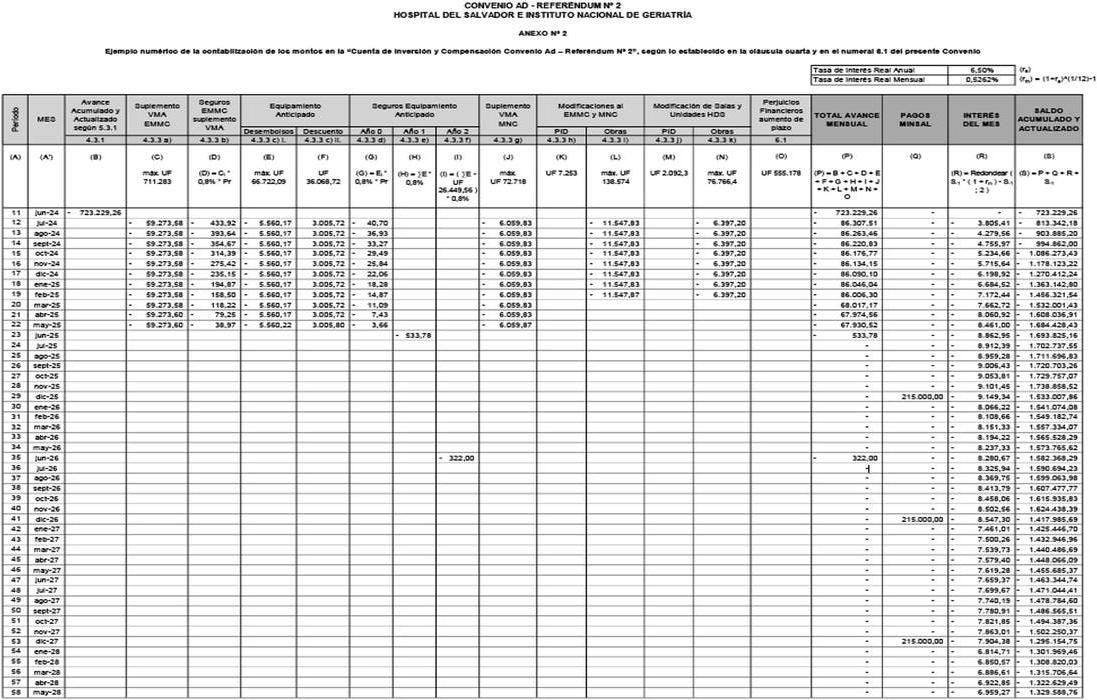 5.11 Una vez contabilizados en la "Cuenta de Inversión y Compensación Convenio Ad – Referéndum Nº 2" la totalidad de los montos que corresponda según lo establecido en los numerales 4.3.1, 4.3.2 y 6.1 del presente Convenio, y emitida la última de las Resoluciones por Valores Devengados materia de la presente cláusula, en un plazo máximo de 30 días, contado desde la fecha de emisión de dicha Resolución, el Inspector Fiscal deberá presentar al Ministerio de Salud un informe donde se certifique los montos comprometidos en las Resoluciones por Valores Devengados que hubiese suscrito junto a la Sociedad Concesionaria, determinando el detalle de los pagos futuros que deberá efectuar el Minsal para cumplir los citados compromisos.