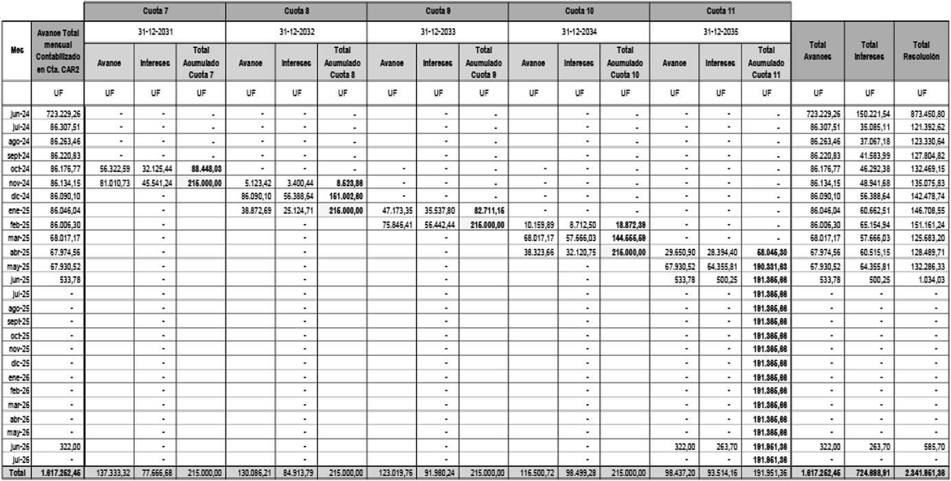 5.6 Si a la fecha de la emisión de cada una de las Resoluciones mensuales, el monto comprometido en las Resoluciones por Valores Devengados ya emitidas, incluyendo los intereses calculados a la fecha de pago correspondiente, es menor o igual a la suma señalada en la letra a. del numeral 5.1 del presente Convenio, éstas serán pagadas en la fecha señalada en dicha letra a. Las sumas calculadas, incluyendo los intereses correspondientes, que excedan la cantidad señalada en la letra a. del numeral 5.1, serán pagadas en la fecha señalada en la letra b. del mismo numeral, adicionándose a dicho excedente los intereses que correspondan, utilizando la tasa de interés que resulte del proceso señalado en el numeral 4.2 del presente Convenio, expresada en su fracción mensual compuesta, por el tiempo que transcurra entre la fecha de la letra a. y la fecha de la letra b. del numeral 5.1. Las sumas calculadas, incluyendo los intereses correspondientes, que excedan la cantidad señalada en la letra b. del numeral 5.1 serán pagadas en la fecha señalada en la letra c. del mismo numeral, adicionándose a dicho excedente los intereses que correspondan, utilizando la tasa de interés que resulte del proceso señalado en el numeral 4.2 del presente Convenio, expresada en su fracción mensual compuesta, por el tiempo que transcurra entre la fecha de la letra b. y la fecha de la letra c. del numeral 5.1, y así sucesivamente, hasta las cantidades que resulten en la cuota señalada en la letra k. del mismo numeral.