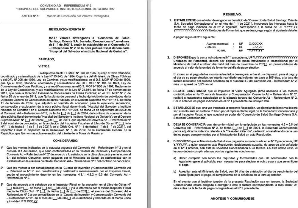 5. Apruébase el Convenio Ad - Referéndum Nº 2 del contrato de concesión de la obra pública fiscal denominada "Hospital del Salvador e Instituto Nacional de Geriatría", de fecha 23 de febrero de 2024, celebrado entre la Dirección General de Concesiones de Obras Públicas, representada por su Director General (S), Sr. Víctor Neira Rivas, y "Consorcio de Salud Santiago Oriente S.A. Sociedad Concesionaria", debidamente representada por don Gibránn Zavala Crisanto y por don Camilo Marín Restrepo, cuyo texto es el siguiente: