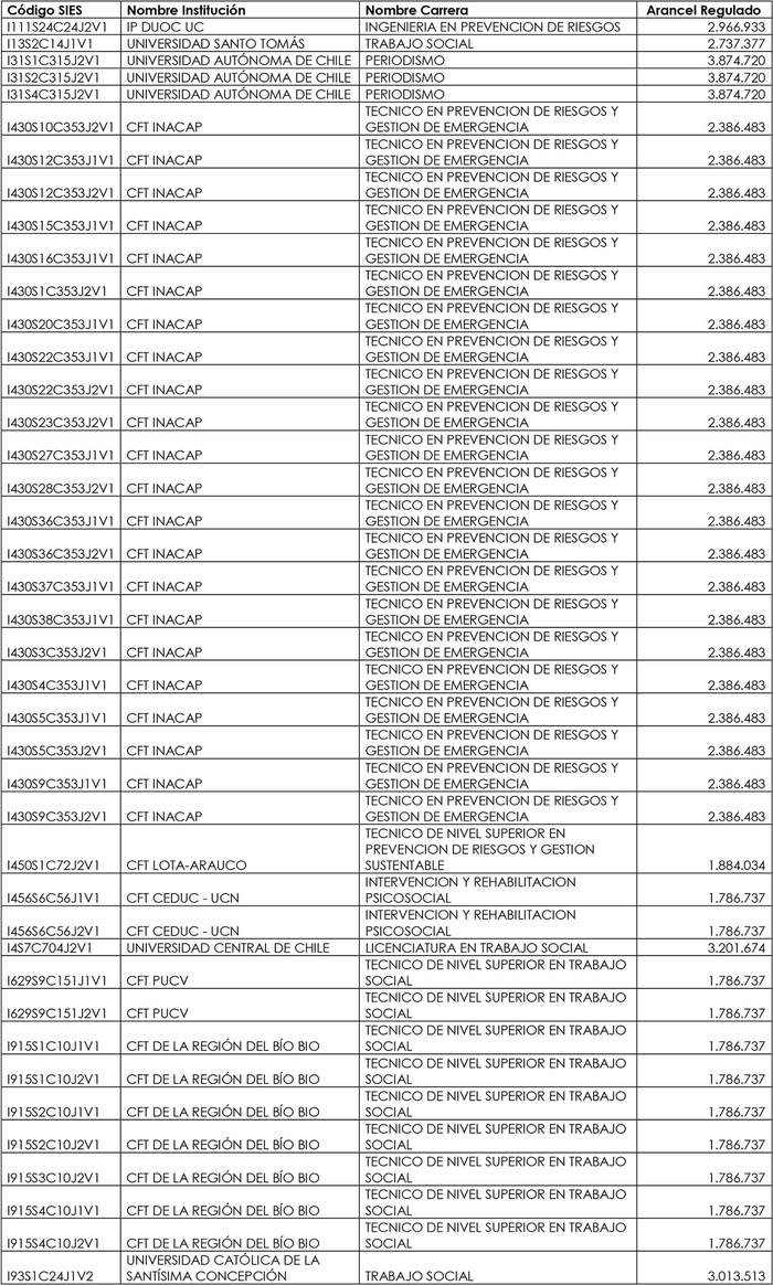 En ese sentido, las carreras y programas que se eliminaron de la resolución exenta Nº 323, de 2024, corresponden a las siguientes: Ingeniería en Prevención de Riesgos del Instituto Profesional Duoc UC; Trabajo Social de la Universidad Santo Tomás; 3 programas de Periodismo en la Universidad Autónoma; 22 programas de Técnico en Prevención de Riesgos y Gestión de Emergencia del Centro de Formación Técnica Inacap; Técnico de Nivel Superior en Prevención de Riesgos y Gestión Sustentable del Centro de Formación Técnica Lota-Arauco; 2 programas de Intervención y Rehabilitación Psicosocial del Centro de Formación Técnica Ceduc-UCN; Licenciatura en Trabajo Social en la Universidad Central; 2 programas de Técnico de Nivel Superior en Trabajo Social del Centro de Formación Técnica PUCV; 8 programas de Técnico de Nivel Superior en Trabajo Social del Centro de Formación Técnica de la Región del Biobío, y Trabajo Social de la Universidad Católica de la Santísima Concepción.