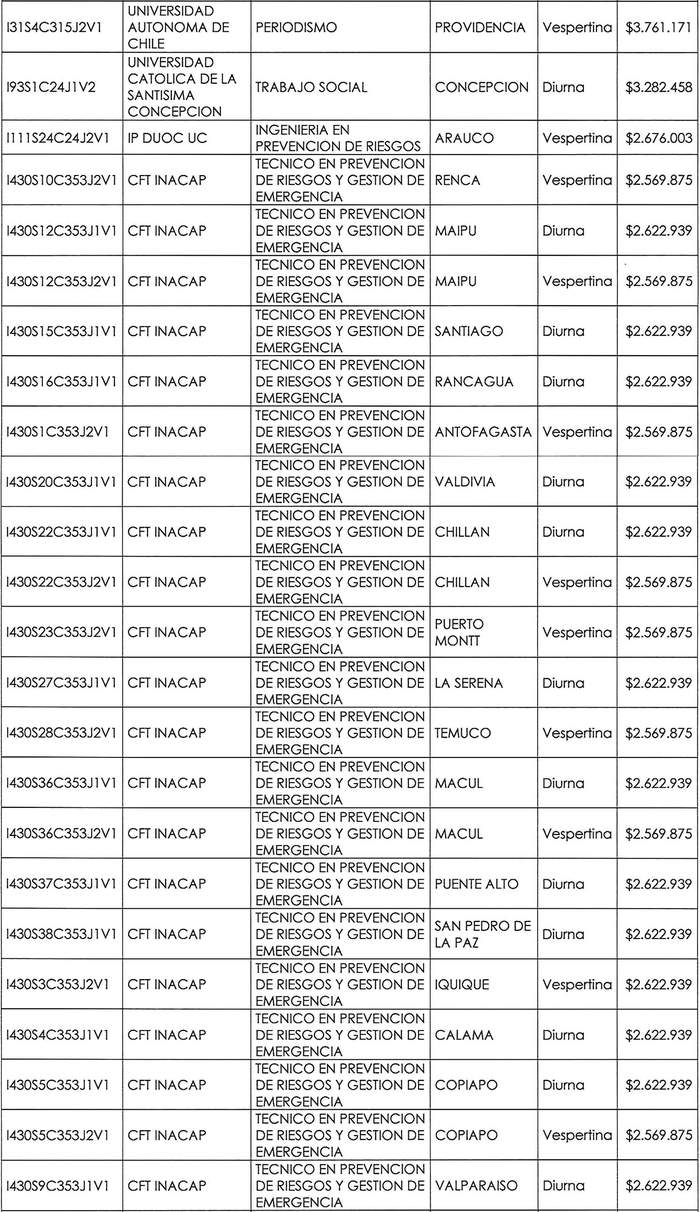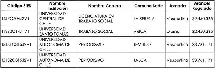 Artículo primero.- Compleméntase la resolución exenta Nº 2.483, de 2023, de la Subsecretaría de Educación Superior, incorporándose en su artículo segundo, el siguiente listado de Valores de los Aranceles Regulados por grupo de carreras, correspondientes a los nuevos programas a impartirse el año académico 2024, expresados en pesos por estudiante, de conformidad a lo dispuesto en el artículo 93 de la ley Nº 21.091: