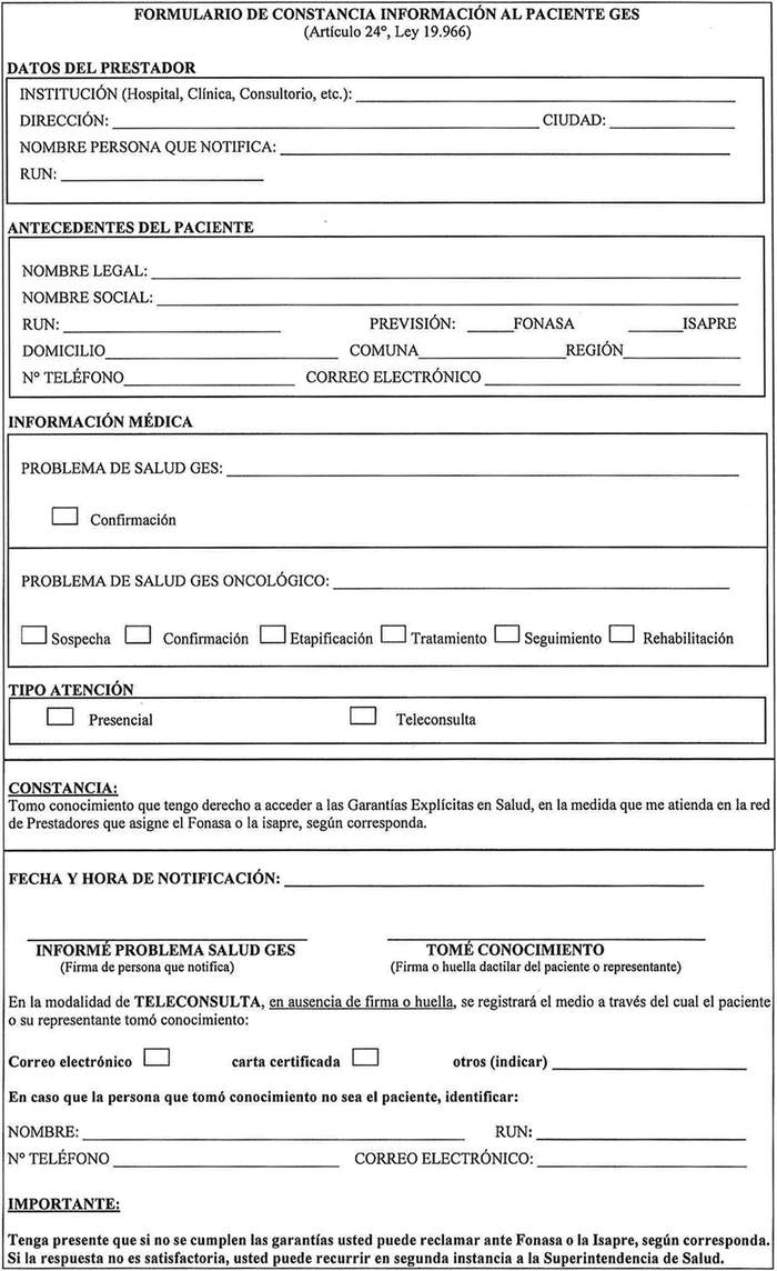 Ajustar el procedimiento de notificación al paciente GES, estableciendo la obligación de la persona profesional de la salud, de emitirlo para los cambios de intervención sanitaria, únicamente en aquellos casos de patologías oncológicas con el fin de facilitar la determinación de hitos que pudiesen ser de utilidad para la aplicación del derecho al olvido oncológico consagrado en la ley N° 21.258 (Ley del Cáncer). Asimismo, se establece expresamente la autorización a los prestadores de salud de almacenar digitalmente los formularios que hubiesen sido llenados de forma manual.