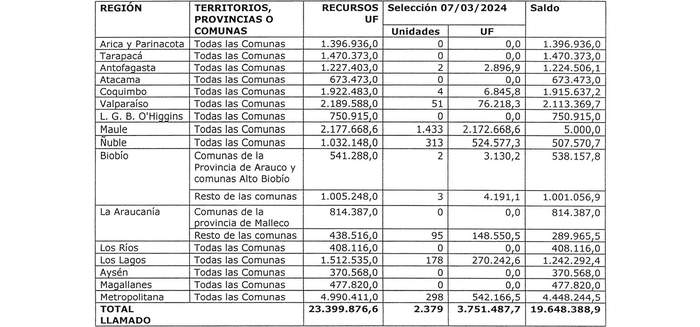 4. Los recursos comprometidos en el Resuelvo 2., para los proyectos seleccionados en el cierre de postulación efectuado el día 9 de abril de 2024, del concurso a que se llamó por resolución exenta Nº 325 (V. y U.), de 2024, se resumen en el siguiente cuadro para cada región del país, incluyendo la suma total de familias beneficiadas y las Unidades de Fomento comprometidas, considerando los montos de subsidio de los proyectos, incluidos sus respectivos servicios de asistencia técnica y fiscalización técnica de obras: