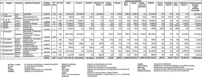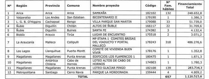 2. Apruébase la siguiente nómina de proyectos seleccionados, con su respectivo financiamiento total, para el otorgamiento de subsidios del Programa Habitacional Fondo Solidario de Elección de Vivienda en la alternativa de postulación colectiva, para los proyectos de Construcción en Nuevos Terrenos, en las regiones de Arica y Parinacota, de Valparaíso, del Libertador General Bernardo O'Higgins, de Ñuble, del Biobío, de La Araucanía, de Los Lagos, de Magallanes y la Antártica Chilena y Metropolitana de Santiago, correspondiente al proceso de selección cuyo cierre de postulación se verificó el día 9 de abril de 2024, del llamado efectuado por resolución exenta Nº 325 (V. y U.), de 2024: