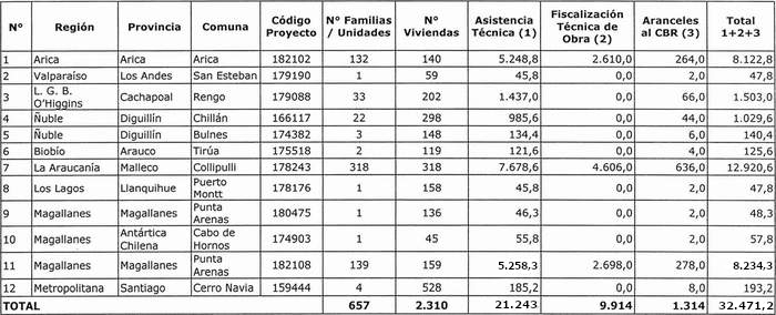 En el caso de la Fiscalización Técnica de Obras, de acuerdo a la totalidad de viviendas del proyecto y según mecanismo expresado en el artículo 4º número 17 de la resolución exenta Nº 1.875 ya citada y lo señalado en el resuelvo 2. de la resolución exenta Nº 325 (V. y U), de 2024, para los proyectos señalados en las filas 2, 3, 4, 5, 6, 8, 9, 10 y 12 de la tabla inserta en el presente resuelvo. Así mismo, de acuerdo con la totalidad de viviendas y según el mecanismo expresado en la resolución exenta Nº 490 (V. y U.), de 2023, citada en el visto f), fueron calculados los proyectos señalados en las filas 1, 7 y 11.