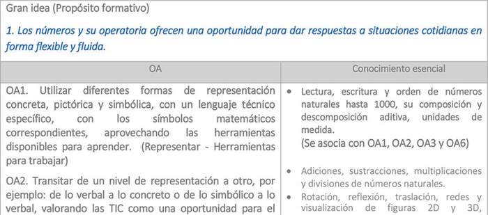 La decisión de definir las habilidades y aptitudes como núcleo central del aprendizaje en estas bases curriculares, tiene como propósito principal favorecer la flexibilidad curricular y la respuesta a la diversidad en el aprendizaje, por cuanto posibilita la integración de distintos contenidos disciplinares, facilita la integración de estudiantes con trayectorias y necesidades educativas diversas, y da espacio a la actualización permanente del conocimiento. Los objetivos de aprendizaje de habilidades y aptitudes que proponen las bases curriculares se integran con conocimientos esenciales en cada área/eje del aprendizaje, y en su conjunto permitirán el desarrollo de aprendizajes profundos y significativos. Esto permitirá desarrollar la comprensión de grandes ideas en cada área del aprendizaje, que puedan ser transferidas a distintas áreas del conocimiento y de la vida de los estudiantes, y utilizadas en diversos contextos y con distintos propósitos.