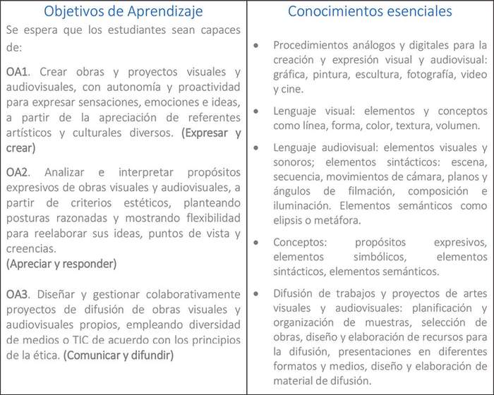 La asignatura de Artes Visuales para los niveles 1 y 2 de la educación media busca fortalecer y estimular habilidades propias del pensamiento creativo como medio para expresarse, crear y proponer soluciones innovadoras a problemas de distinta índole, aportando a la calidad de vida de las personas. Se pretende que los estudiantes conozcan y comprendan los diferentes componentes del lenguaje visual y audiovisual como una herramienta clave para convivir y dialogar con un entorno poblado de estímulos visuales y audiovisuales, como es el caso del mundo digital y virtual, apropiándose conscientemente de las herramientas que ofrecen las TIC, para utilizarlas en sus trabajos y proyectos visuales y audiovisuales. También tiene como propósito enseñar y desarrollar habilidades propias de la apreciación estética, lo que implica ejercitar tanto la percepción sensible y la observación como el conocimiento y manejo de criterios estéticos para el análisis, la reflexión y la formulación de juicios frente a obras visuales y audiovisuales, tanto propias como de otros.